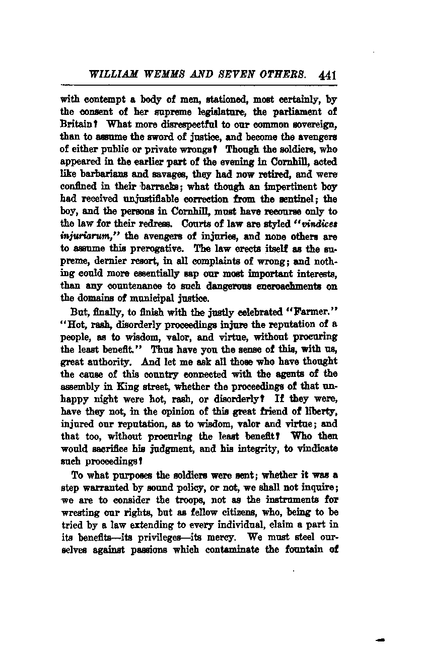 How can we regard with contempt a body of men stationed, most certainly, by the consent of her supreme legislature, the Parliament of Britain? What could be more disrespectful to our common sovereign than to assume the sword of justice and become the avengers of either public or private wrongs? Though the soldiers who appeared in the earlier part of the evening in Cornhill acted like barbarians and savages, they had now retired and were confined in their barracks. What though an impertinent boy had received unjustifiable correction from the sentinel? The boy and the persons in Cornhill must have recourse only to the law for their redress. Courts of law are styled "vindices injuriarum," the avengers of injuries, and none others are to assume this prerogative. The law erects itself as the supreme, dernier resort in all complaints of wrong, and nothing could more essentially sap our most important interests than any countenance to such dangerous encroachments on the domains of municipal justice.