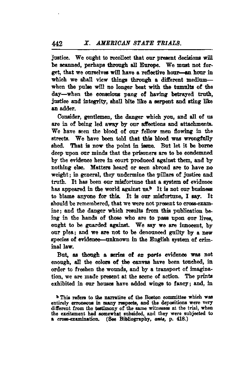 But, as though a series of ex parte evidence was not enough, all the colors of the canvas have been touched, in order to freshen the wounds, and by a transport of imagination, we are made present at the scene of action. The prints exhibited in our houses have added wings to fancy; and, in this way, the narrative of the Boston committee, which was entirely erroneous in many respects, has influenced public perception. The depositions were very different from the testimony of the same witnesses at the trial, when the excitement had somewhat subsided, and they were subjected to a cross-examination.*