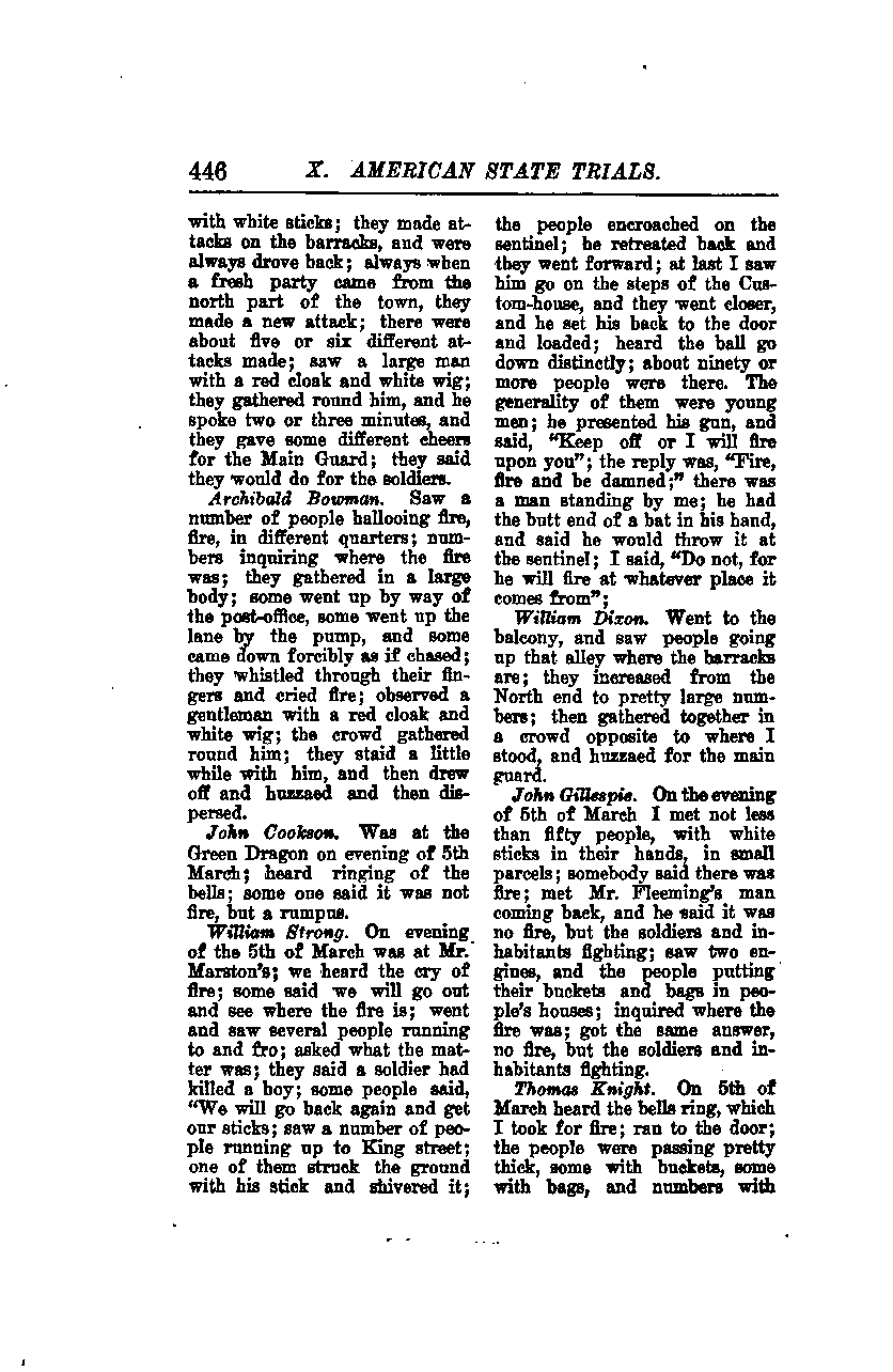 John Gillespie, on the evening of March 5th, met no less than fifty people, with white sticks in their hands, in small groups. Someone said there was a fire. I met Mr. Fleeming's man coming back, and he said it was no fire, but the soldiers and inhabitants fighting. I saw two engines, and the people putting their buckets and bags in people's houses. I inquired where the fire was and got the same answer: no fire, but the soldiers and inhabitants fighting.