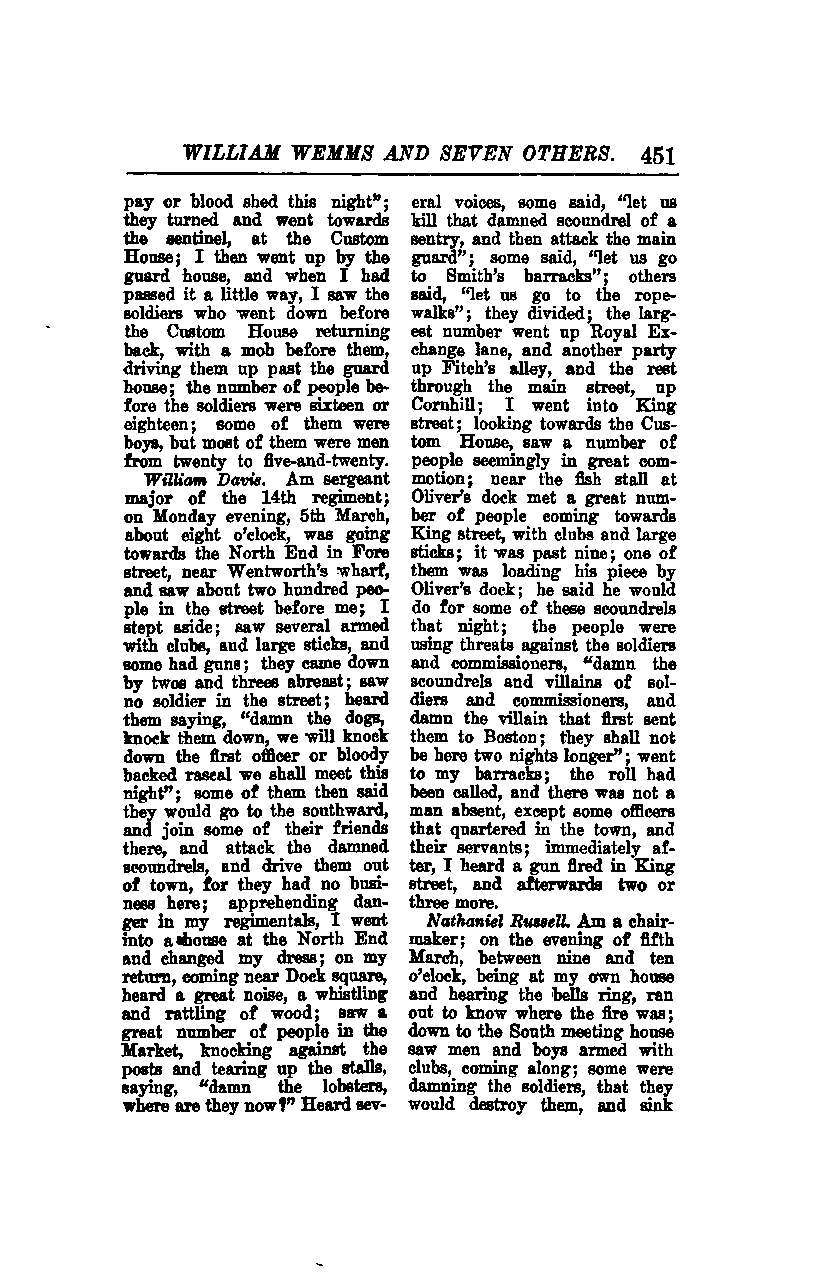 Nathaniel Russell, a chairmaker, was at his own house on the evening of March 5th, between nine and ten o'clock, when he heard the bells ring. He ran out to see where the fire was and went down to the South Meeting House, where he saw men and boys armed with clubs coming along. Some were cursing the soldiers, saying they would destroy them and sink them.