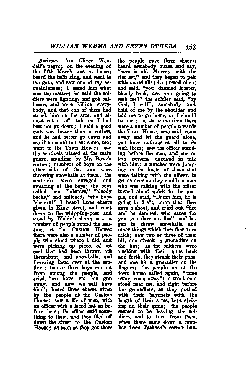 Andrew: I am Oliver Wendell's negro. On the evening of the fifth of March, I was at home when I heard the bells ring. I went to the gate and saw one of my acquaintances. I asked him what was the matter, and he said the soldiers were fighting, had got cutlasses, and were killing everybody. He told me that one of them had struck him on the arm and almost cut it off. He advised me not to go down, but I said a good club was better than a cutlass, and he had better go down and see if he could not cut some, too.