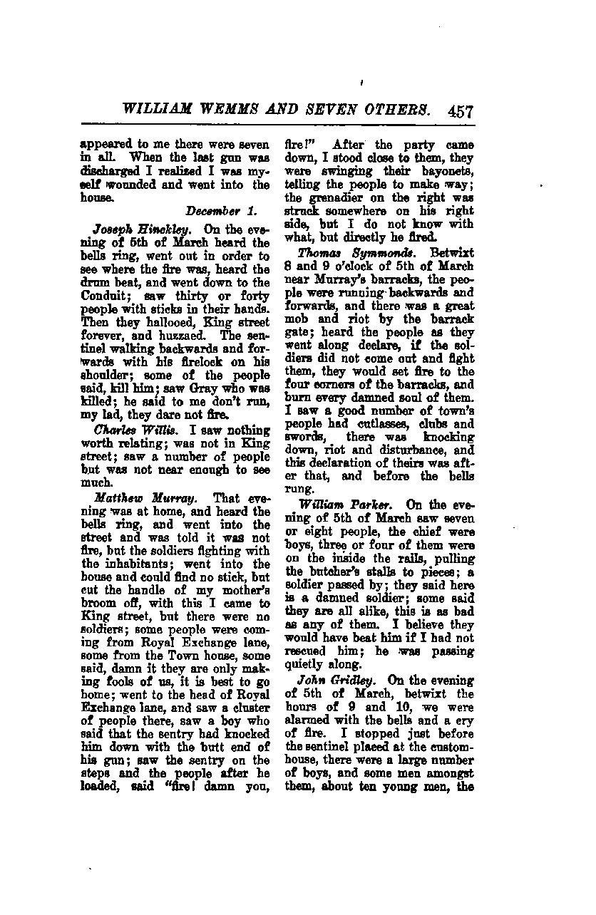 Between 8 and 9 o'clock on the 5th of March, near Murray’s barracks, the people were running backwards and forwards. There was a great mob and riot by the barrack gate. I heard the people, as they went along, declare that if the soldiers did not come out and fight them, they would set fire to the four corners of the barracks and burn every damned soul of them. I saw a good number of townspeople with cutlasses, clubs, and swords. There was knocking down, riot, and disturbance, and this declaration of theirs was after that and before the bells rang.