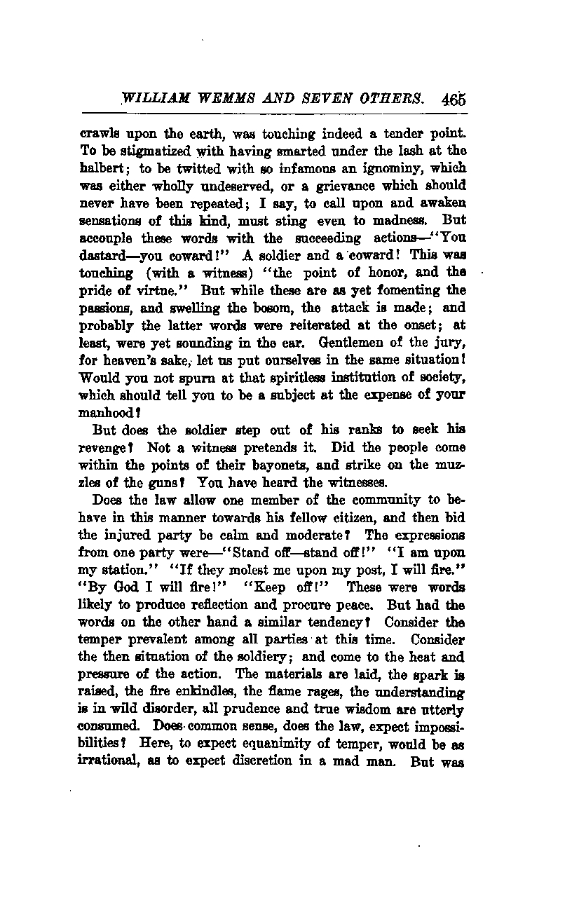 Does the law allow one member of the community to behave in this manner towards his fellow citizen, and then bid the injured party be calm and moderate? The expressions from one party were—"Stand off—stand off!" "I am upon my station." "If they molest me upon my post, I will fire." "By God, I will fire!" "Keep off!" These were words likely to produce reflection and procure peace. But had the words on the other hand a similar tendency? Consider the temper prevalent among all parties at this time. Consider the then situation of the soldiery; and come to the heat and pressure of the action. The materials are laid, the spark is raised, the fire enkindles, the flame rages, the understanding is in wild disorder, all prudence and true wisdom are utterly consumed. Does common sense, does the law, expect impossibilities? Here, to expect equanimity of temper, would be as irrational as to expect discretion in a madman.
