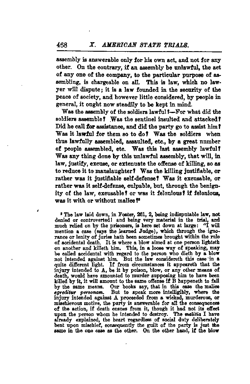 Was the assembly of the soldiers lawful? For what purpose did the soldiers gather? Was the sentinel insulted and attacked? Did he call for assistance, and did the party go to assist him? Was it lawful for them to do so? When the soldiers were lawfully assembled, were they assaulted by a large number of people? Was this latter assembly lawful? Did the unlawful assembly do anything that would, in law, justify, excuse, or mitigate the offense of killing, so as to reduce it to manslaughter? Was the killing justifiable, or rather, was it justifiable self-defense? Was it excusable, or rather, was it self-defense, culpable but, through the leniency of the law, excusable? Or was it felonious? If felonious, was it with or without malice?