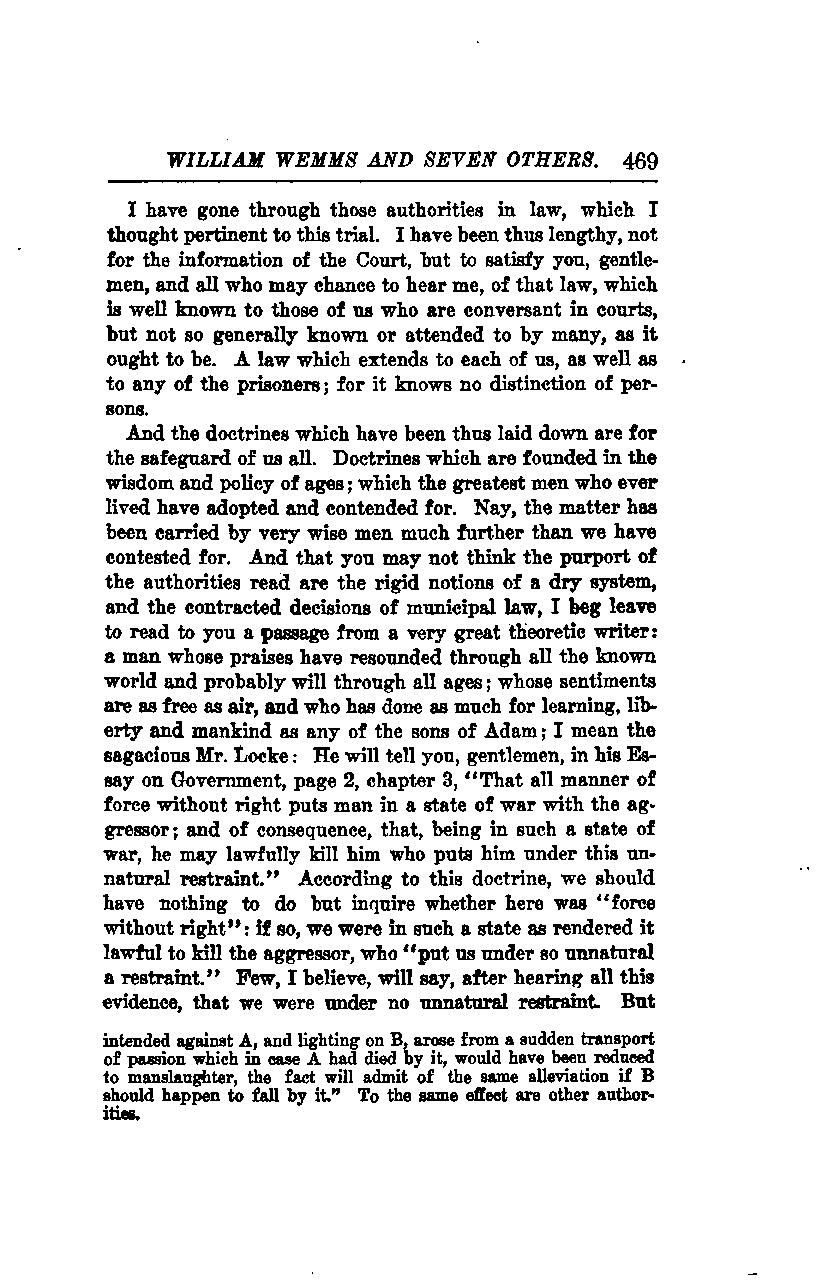 The doctrines which have been thus laid down are for the safeguard of us all. Doctrines which are founded in the wisdom and policy of ages; which the greatest men who ever lived have adopted and contended for. Nay, the matter has been carried by very wise men much further than we have contested for. And that you may not think the purport of the authorities read are the rigid notions of a dry system, and the contracted decisions of municipal law, I beg leave to read to you a passage from a very great theoretic writer: a man whose praises have resounded through all the known world and probably will through all ages; whose sentiments are as free as air, and who has done as much for learning, liberty, and mankind as any of the sons of Adam; I mean the sagacious Mr. Locke. He will tell you, gentlemen, in his Essay on Government, page 2, chapter 3, "That all manner of force without right puts man in a state of war with the aggressor; and of consequence, that, being in such a state of war, he may lawfully kill him who puts him under this unnatural restraint." According to this doctrine, we should have nothing to do but inquire whether here was "force without right": if so, we were in such a state as rendered it lawful to kill the aggressor, who "put us under so unnatural a restraint." Few, I believe, will say, after hearing all this evidence, that we were under no unnatural restraint.
