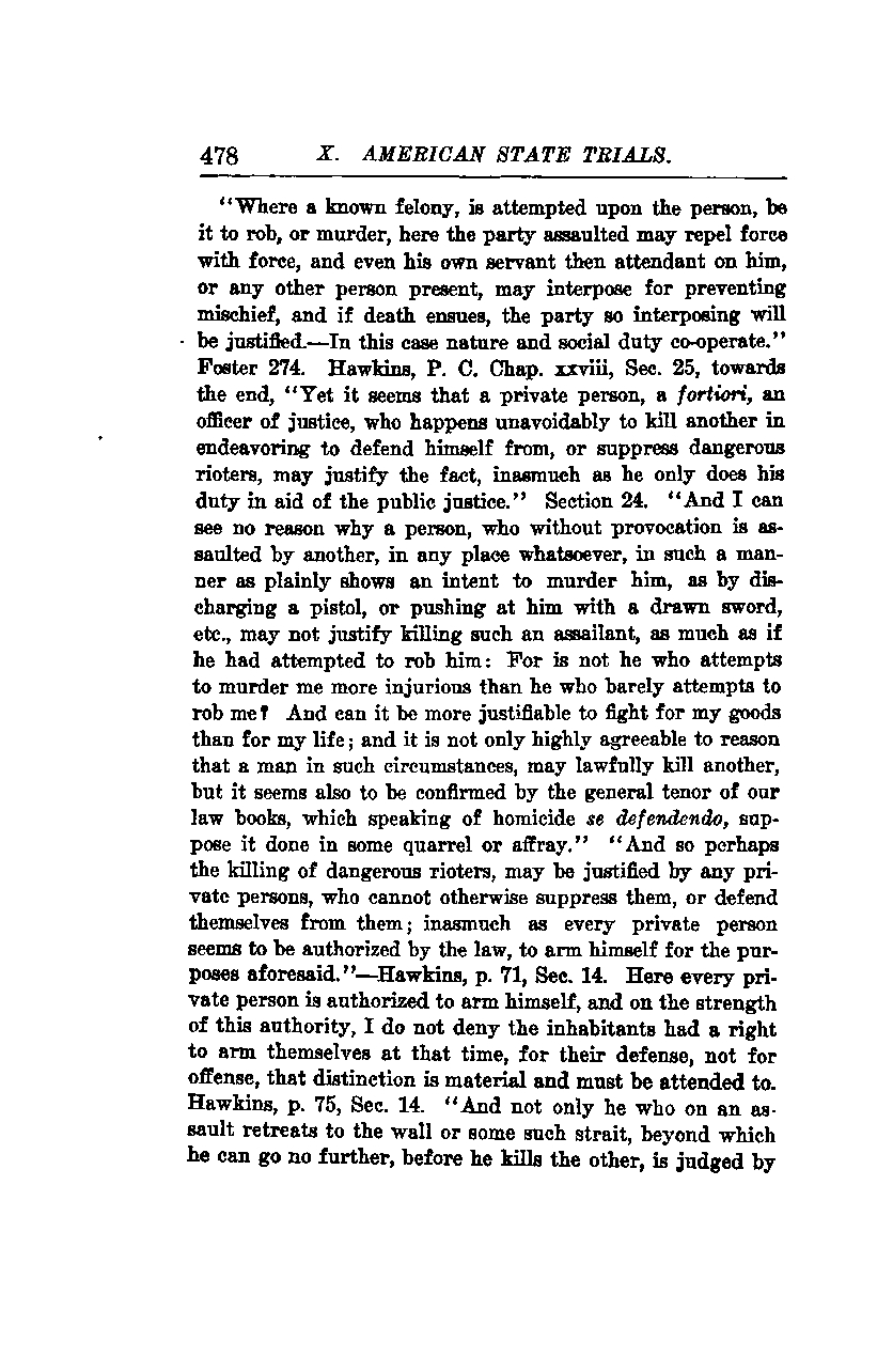 Here, every private person is authorized to arm themselves, and on the strength of this authority, I do not deny the inhabitants had a right to arm themselves at that time for their defense, not for offense. This distinction is material and must be attended to. (Hawkins, p. 75, Sec. 14.)
