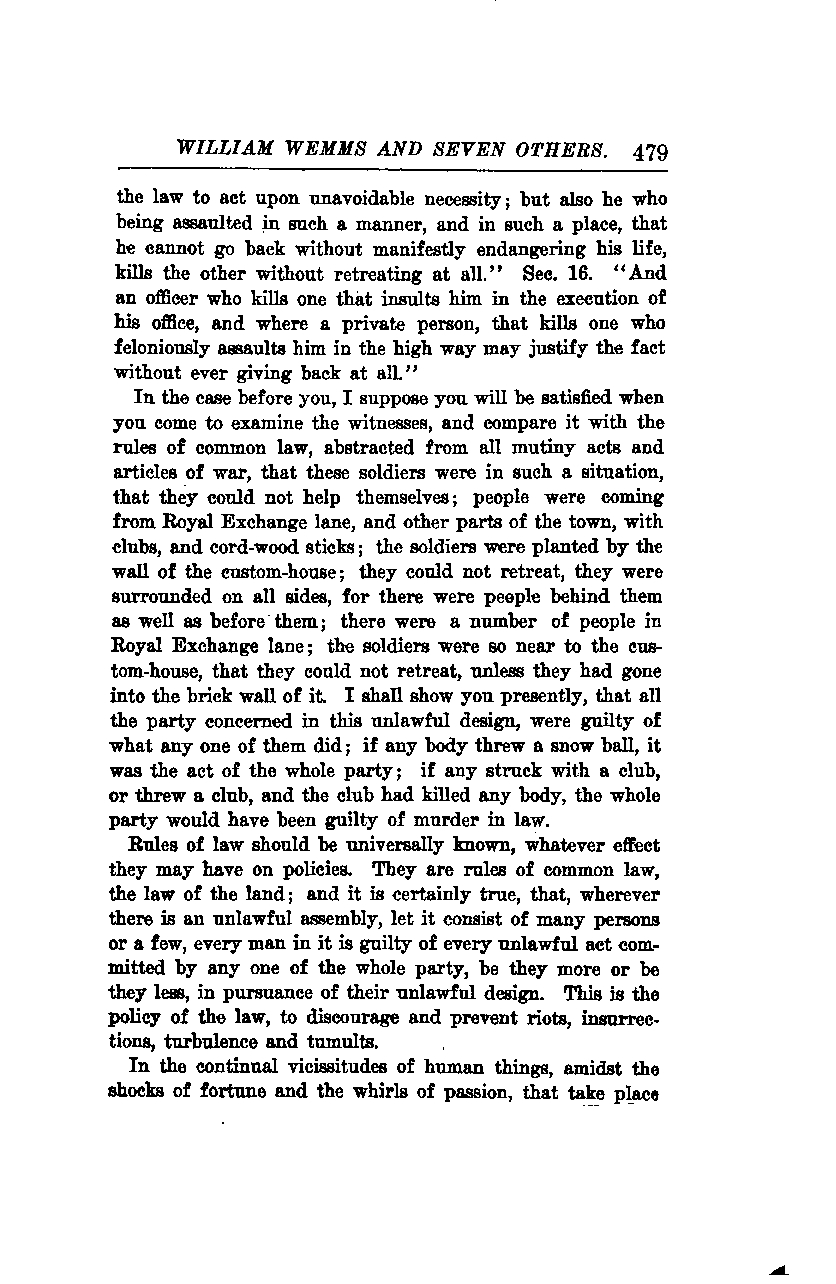 In the case before you, I suppose you will be satisfied when you come to examine the witnesses and compare it with the rules of common law, abstracted from all mutiny acts and articles of war, that these soldiers were in such a situation that they could not help themselves. People were coming from Royal Exchange Lane and other parts of the town with clubs and cord-wood sticks. The soldiers were positioned by the wall of the custom-house; they could not retreat, as they were surrounded on all sides, with people behind them as well as before them. There were a number of people in Royal Exchange Lane; the soldiers were so near to the custom-house that they could not retreat unless they had gone into the brick wall of it. I shall show you presently that all the party concerned in this unlawful design were guilty of what any one of them did; if anybody threw a snowball, it was the act of the whole party; if any struck with a club or threw a club, and the club had killed anybody, the whole party would have been guilty of murder in law.