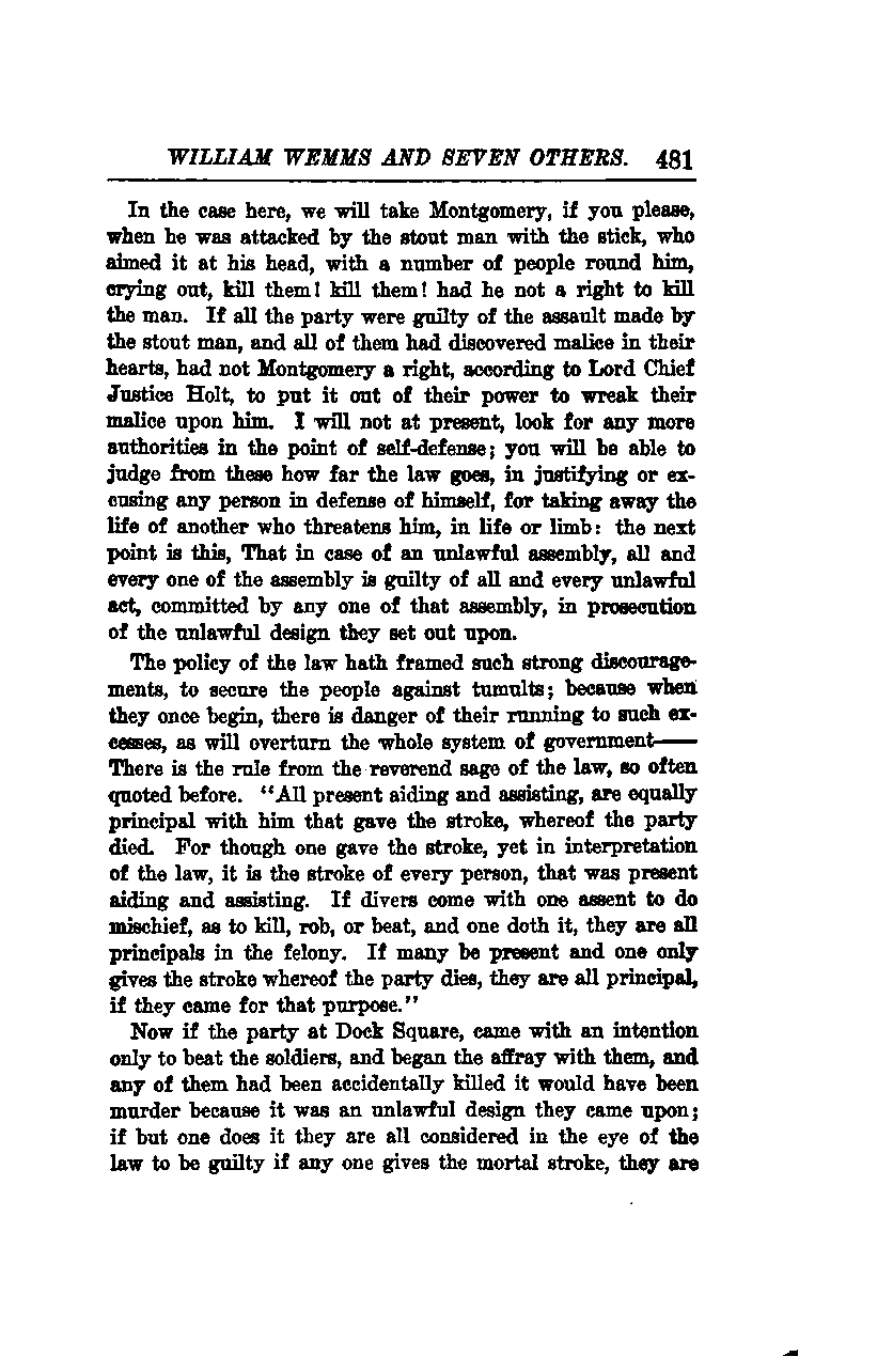 In the case here, we will take Montgomery, if you please, when he was attacked by the stout man with the stick, who aimed it at his head, with a number of people around him, crying out, "Kill them! Kill them!" Had he not a right to kill the man? If all the party were guilty of the assault made by the stout man, and all of them had discovered malice in their hearts, had not Montgomery a right, according to Lord Chief Justice Holt, to put it out of their power to wreak their malice upon him? I will not at present look for any more authorities on the point of self-defense; you will be able to judge from these how far the law goes in justifying or excusing any person in defense of himself for taking away the life of another who threatens him in life or limb.
