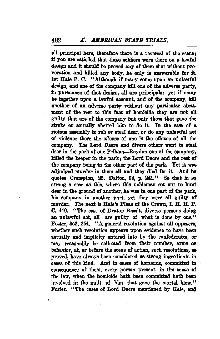The next reference is Hale’s Pleas of the Crown, I. H. H. P. C., 440: "The case of Draton Baasit, diverse persons doing an unlawful act, all are guilty of what is done by one." Foster, 353, 354, states, "A general resolution against all opposers, whether such resolution appears upon evidence to have been actually and implicitly entered into by the confederates, or may reasonably be collected from their number, arms, or behavior, at or before the scene of action, such resolutions, so proved, have always been considered as strong ingredients in cases of this kind. And in cases of homicide, committed in consequence of them, every person present, in the sense of the law, when the homicide hath been committed hath been involved in the guilt of him that gave the mortal blow." Foster also mentions the case of Lord Dacre as cited by Hale.