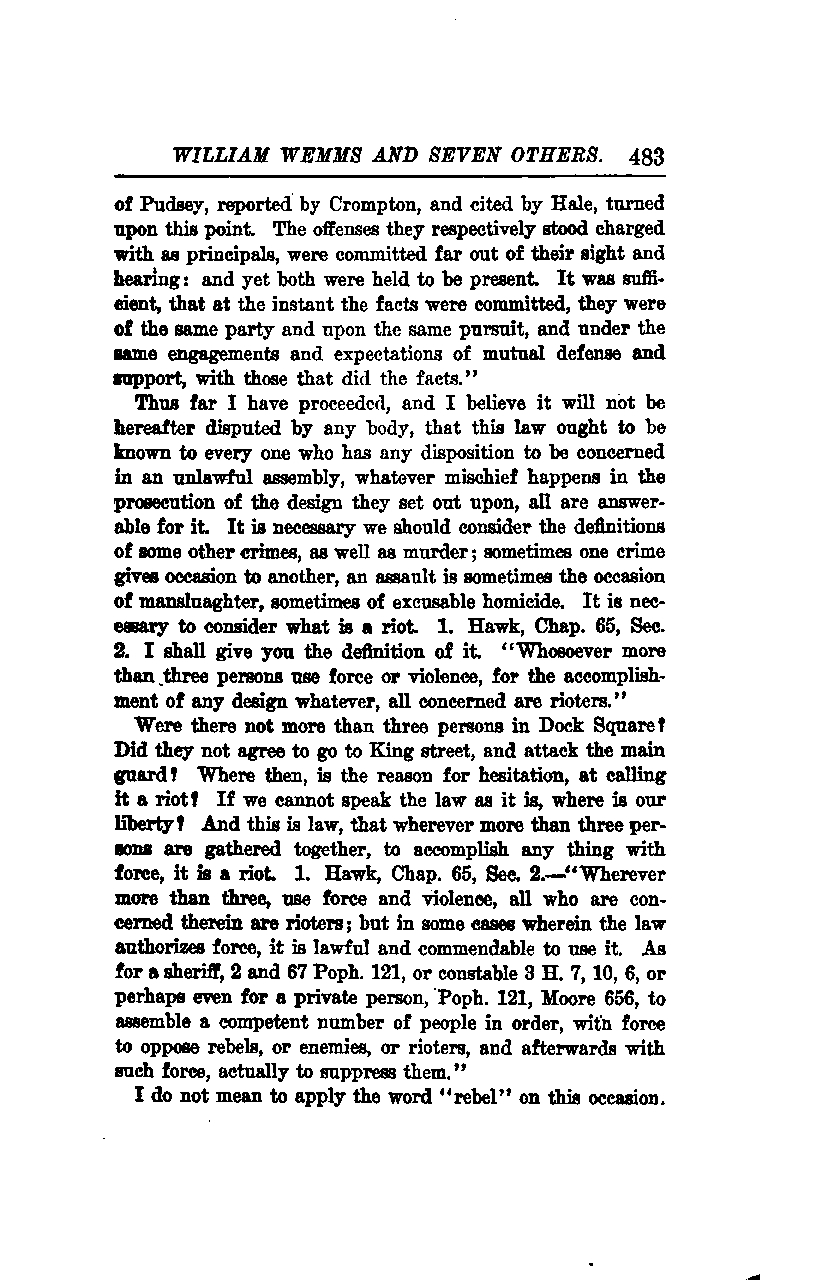 Were there not more than three persons in Dock Square? Did they not agree to go to King Street and attack the main guard? Where then, is the reason for hesitation at calling it a riot? If we cannot speak the law as it is, where is our liberty? And this is law, that wherever more than three persons are gathered together to accomplish anything with force, it is a riot. According to 1 Hawk, Chap. 65, Sec. 2, "Wherever more than three use force and violence, all who are concerned therein are rioters; but in some cases wherein the law authorizes force, it is lawful and commendable to use it. As for a sheriff (2 and 67 Poph. 121), or constable (3 H. 7, 10, 6), or perhaps even for a private person (Poph. 121, Moore 656), to assemble a competent number of people in order, with force to oppose rebels, or enemies, or rioters, and afterwards with such force, actually to suppress them."