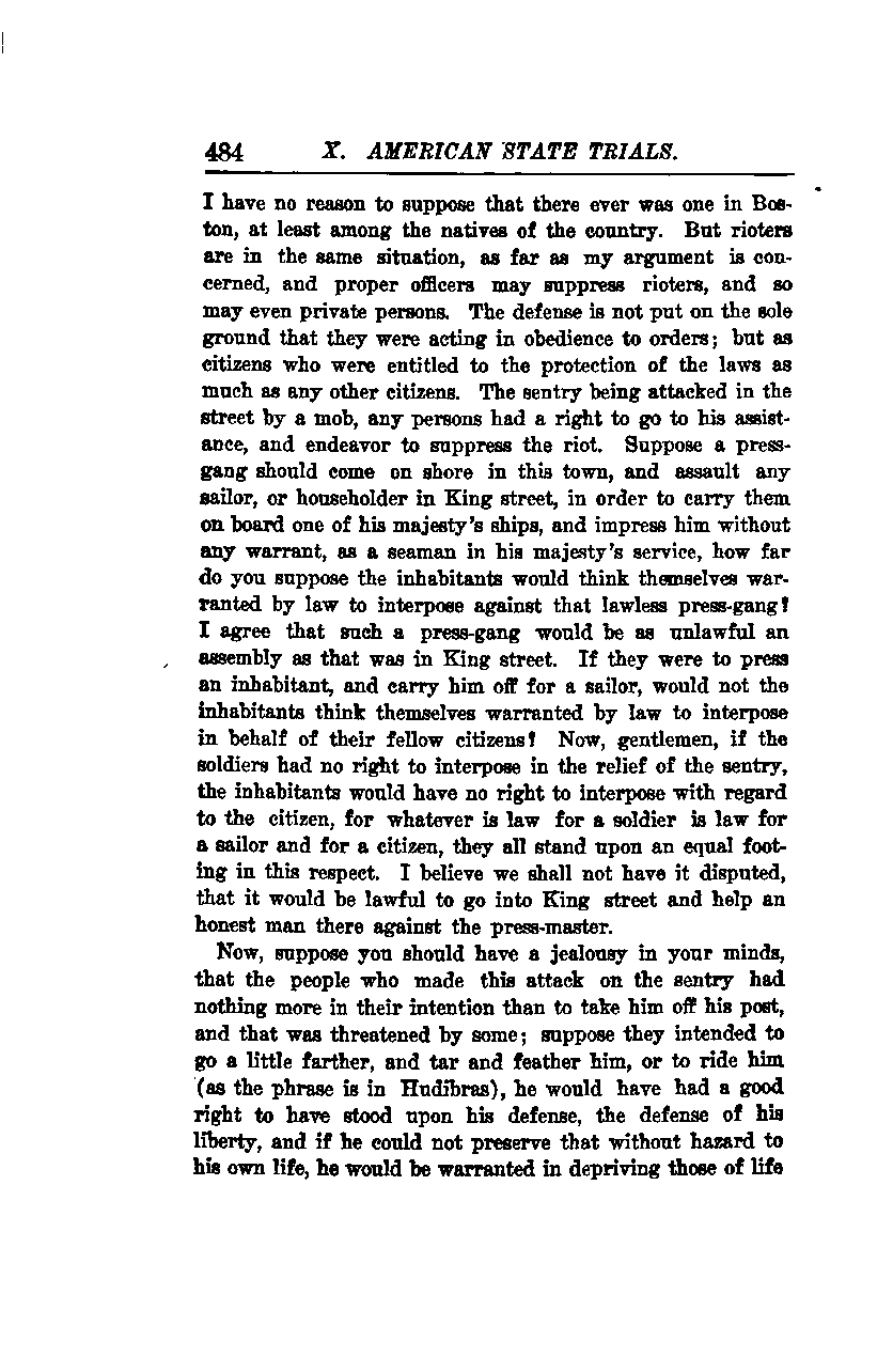 Now, gentlemen, if the soldiers had no right to interpose in the relief of the sentry, the inhabitants would have no right to interpose with regard to the citizen, for whatever is law for a soldier is law for a sailor and for a citizen; they all stand upon an equal footing in this respect. I believe we shall not have it disputed that it would be lawful to go into King Street and help an honest man there against the press-master.