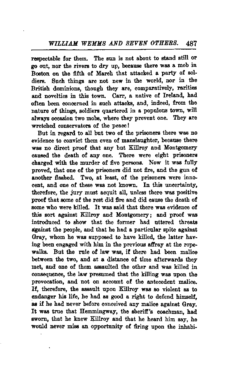 It is not respectable for them. The sun is not about to stand still or go out, nor the rivers to dry up, because there was a mob in Boston on the fifth of March that attacked a party of soldiers. Such things are not new in the world, nor in the British dominions, though they are, comparatively, rarities and novelties in this town. Carr, a native of Ireland, had often been concerned in such attacks, and, indeed, from the nature of things, soldiers quartered in a populous town will always occasion two mobs where they prevent one. They are wretched conservators of the peace!