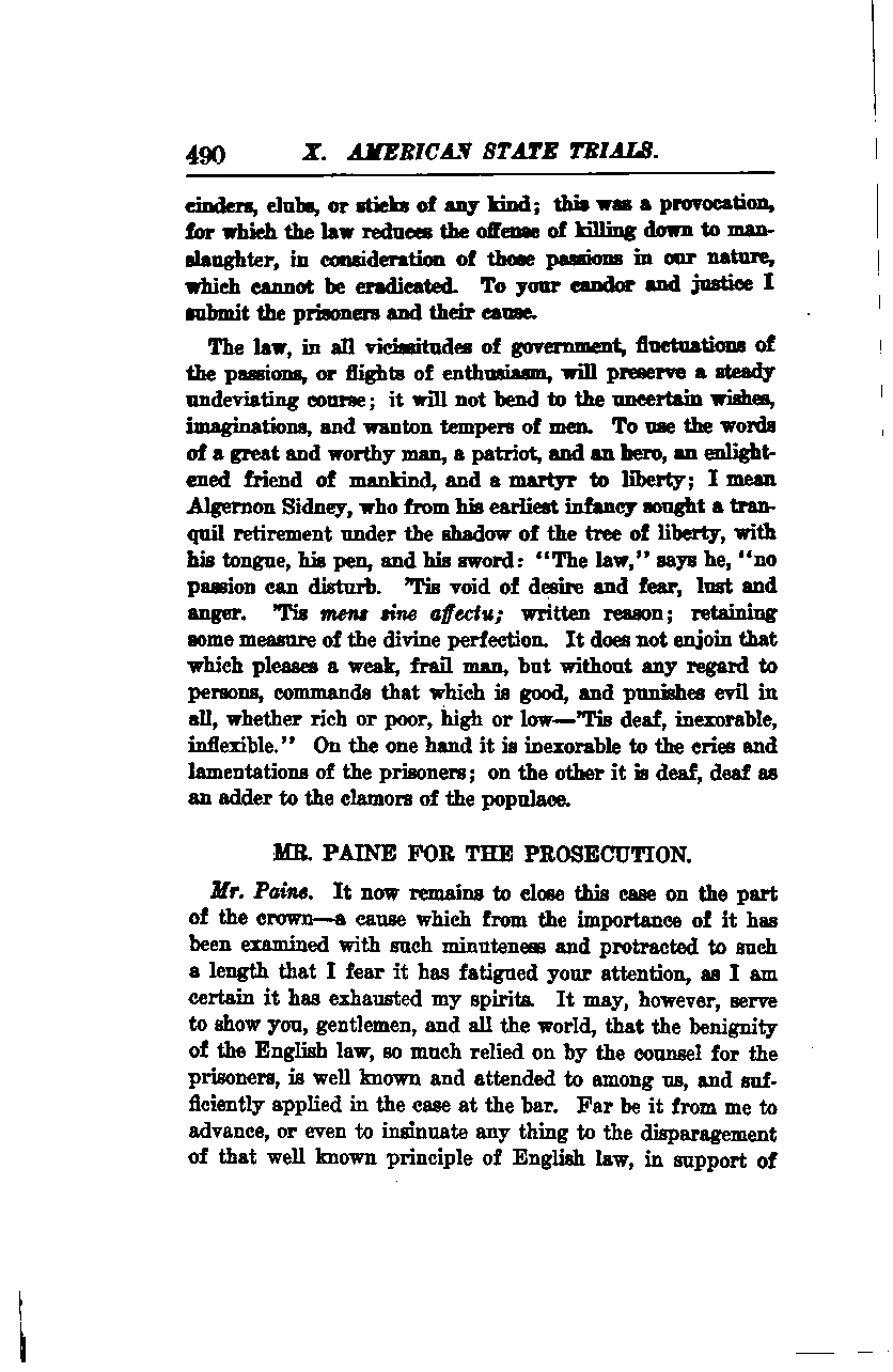 Mr. Paine: It now remains to close this case on the part of the crown—a cause which, from its importance, has been examined with such minuteness and protracted to such a length that I fear it has fatigued your attention, as I am certain it has exhausted my spirits. It may, however, serve to show you, gentlemen, and all the world, that the benignity of the English law, so much relied on by the counsel for the prisoners, is well known and attended to among us, and sufficiently applied in the case at the bar. Far be it from me to advance, or even to insinuate anything to the disparagement of that well-known principle of English law, in support of which I stand here.