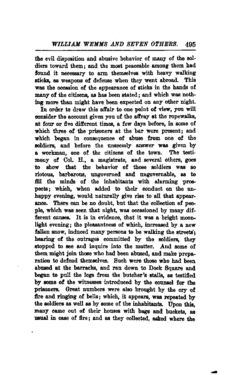 It is in evidence that it was a bright moonlight evening; the pleasantness of which, increased by a new-fallen snow, induced many people to be walking the streets. Hearing of the outrages committed by the soldiers, they stopped to see and inquire into the matter. Some of them might join those who had been abused and make preparations to defend themselves. Such were those who had been abused at the barracks and ran down to Dock Square, where they began to pull the legs from the butcher's stalls, as testified by some of the witnesses introduced by the counsel for the prisoners. Great numbers were also brought by the cry of fire and the ringing of bells, which, it appears, was repeated by the soldiers as well as by some of the inhabitants. Upon this, many came out of their houses with bags and buckets, as usual in case of fire, and as they collected, asked where the fire was located.