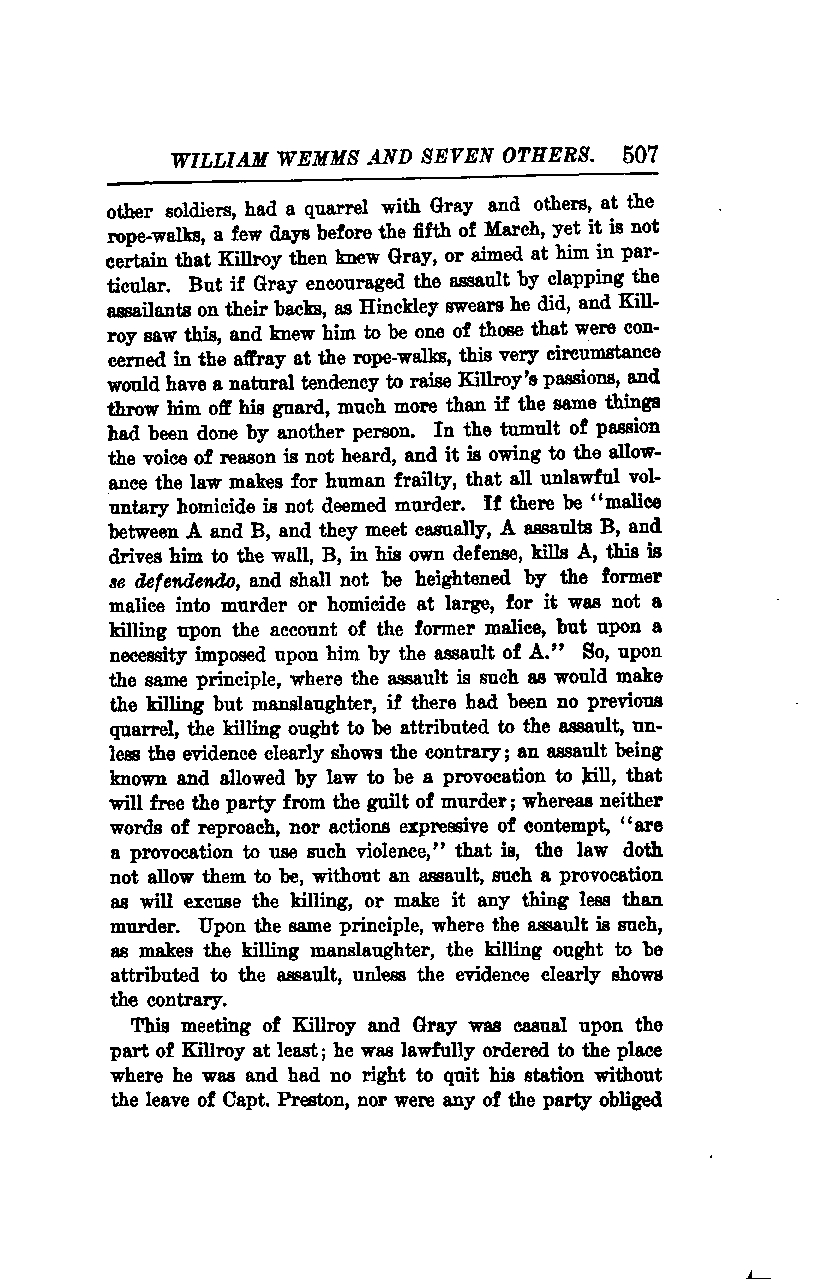 Although Killroy and other soldiers had a quarrel with Gray and others at the rope-walks a few days before the fifth of March, it is not certain that Killroy then knew Gray or aimed at him in particular. However, if Gray encouraged the assault by clapping the assailants on their backs, as Hinckley swears he did, and Killroy saw this and knew him to be one of those involved in the affray at the rope-walks, this very circumstance would have a natural tendency to raise Killroy's passions and throw him off his guard, much more than if the same things had been done by another person. In the tumult of passion, the voice of reason is not heard, and it is owing to the allowance the law makes for human frailty that all unlawful voluntary homicide is not deemed murder.