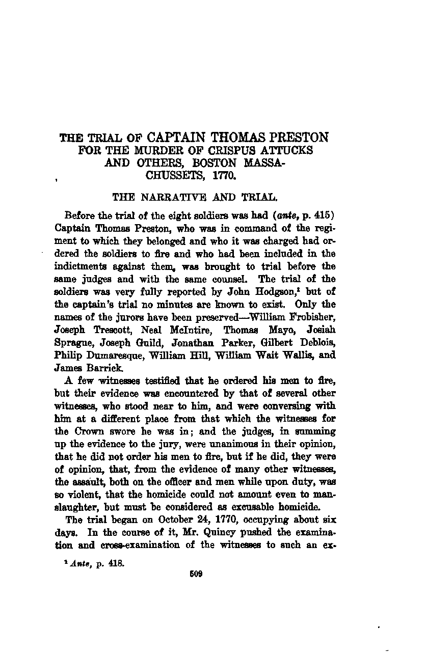 THE TRIAL OF CAPTAIN THOMAS PRESTON FOR THE MURDER OF CRISPUS ATTUCKS AND OTHERS, BOSTON, MASSACHUSETTS, 1770