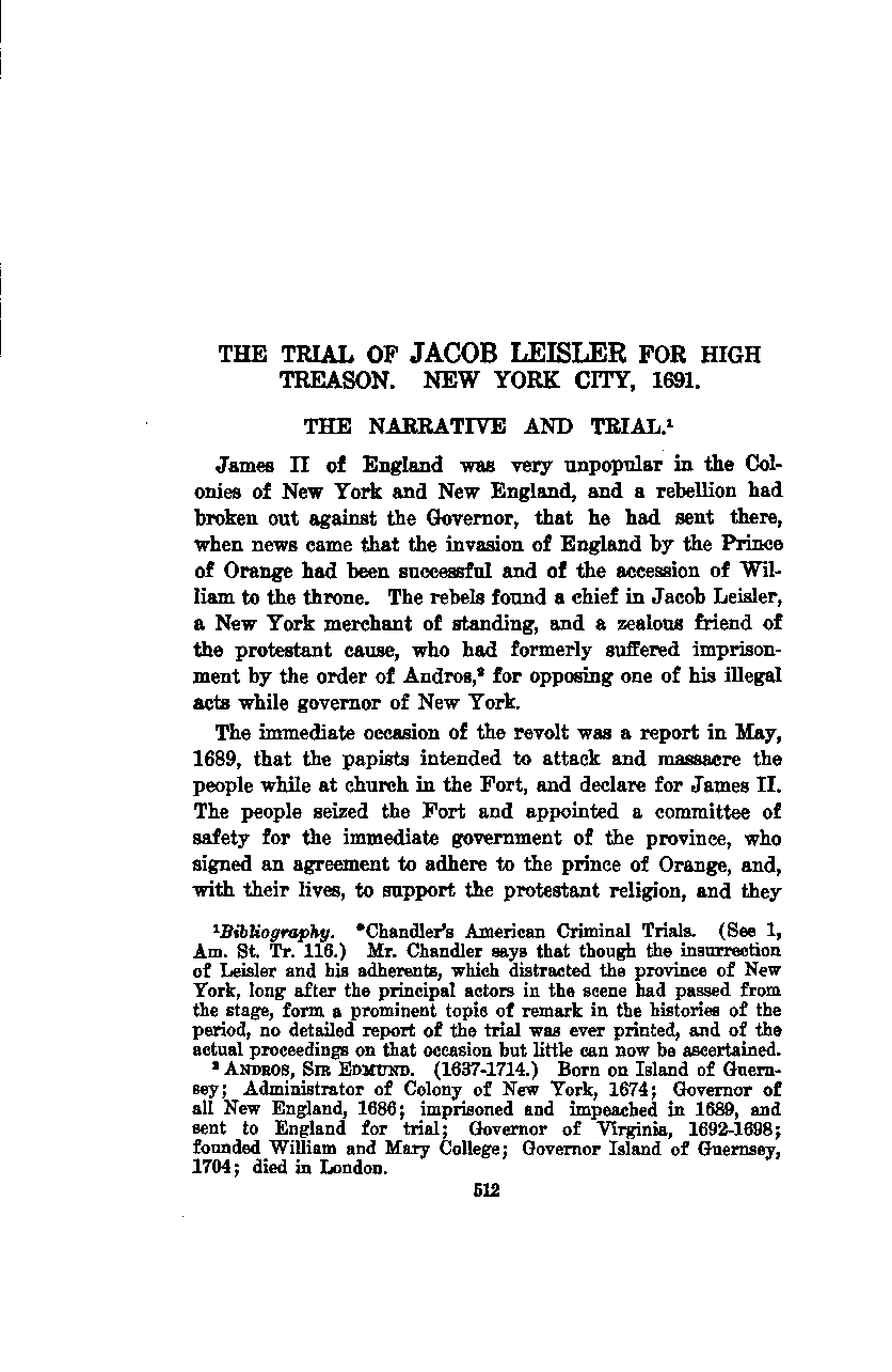 THE TRIAL OF JACOB LEISLER FOR HIGH TREASON, NEW YORK CITY, 1691