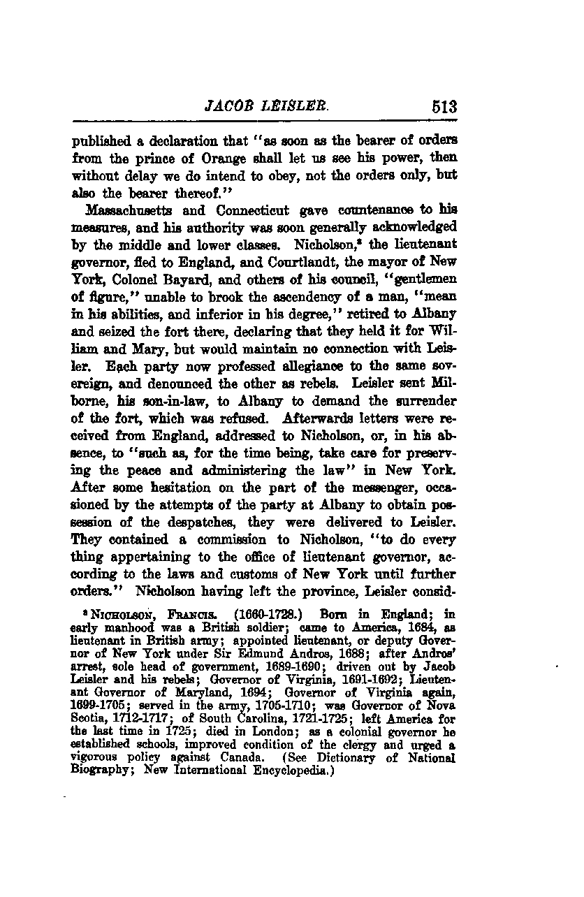 Massachusetts and Connecticut supported his measures, and his authority was soon generally acknowledged by the middle and lower classes. Nicholson, the lieutenant governor, fled to England, and Courtlandt, the mayor of New York, Colonel Bayard, and others of his council, "gentlemen of figure," unable to brook the ascendency of a man "mean in his abilities, and inferior in his degree," retired to Albany and seized the fort there, declaring that they held it for William and Mary, but would maintain no connection with Leisler. Each party now professed allegiance to the same sovereign and denounced the other as rebels. Leisler sent Milborne, his son-in-law, to Albany to demand the surrender of the fort, which was refused. Afterwards, letters were received from England, addressed to Nicholson, or, in his absence, to "such as, for the time being, take care for preserving the peace and administering the law" in New York. After some hesitation on the part of the messenger, occasioned by the attempts of the party at Albany to obtain possession of the despatches, they were delivered to Leisler. They contained a commission to Nicholson "to do everything appertaining to the office of lieutenant governor, according to the laws and customs of New York until further orders." Nicholson having left the province, Leisler considered himself the rightful authority.
