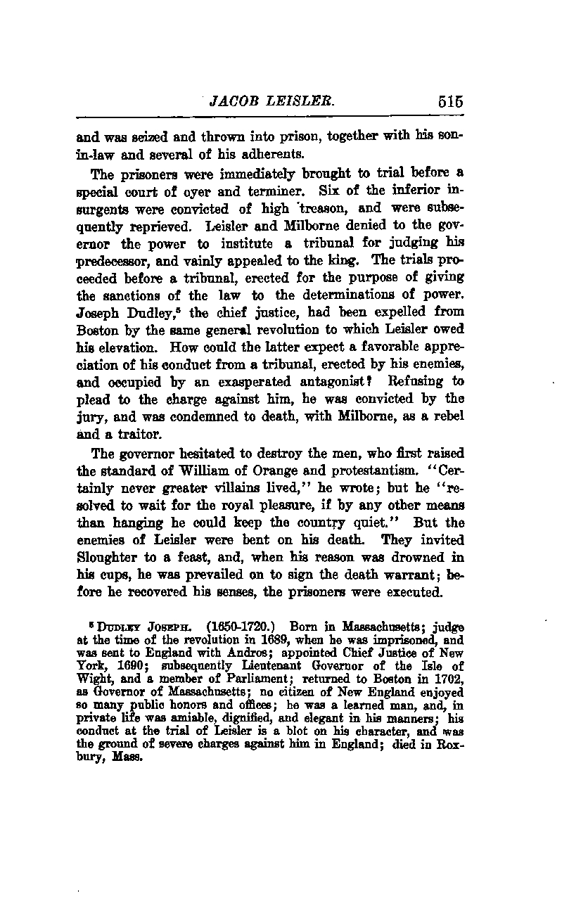 Joseph Dudley, the chief justice, had been expelled from Boston by the same general revolution to which Leisler owed his elevation. How could the latter expect a favorable appreciation of his conduct from a tribunal erected by his enemies and occupied by an exasperated antagonist? Refusing to plead to the charge against him, Leisler was convicted by the jury and condemned to death, along with Milborne, as a rebel and a traitor.
