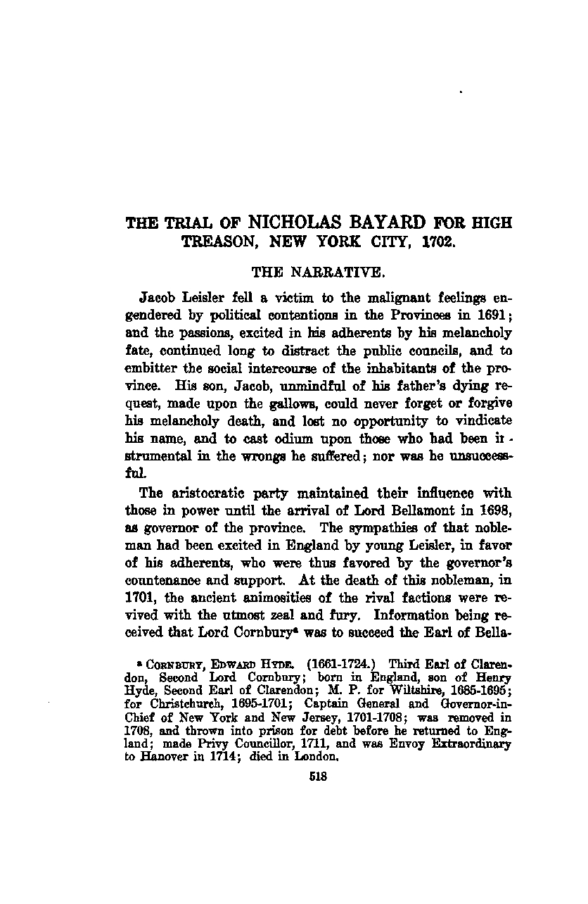 THE TRIAL OF NICHOLAS BAYARD FOR HIGH TREASON, NEW YORK CITY, 1702