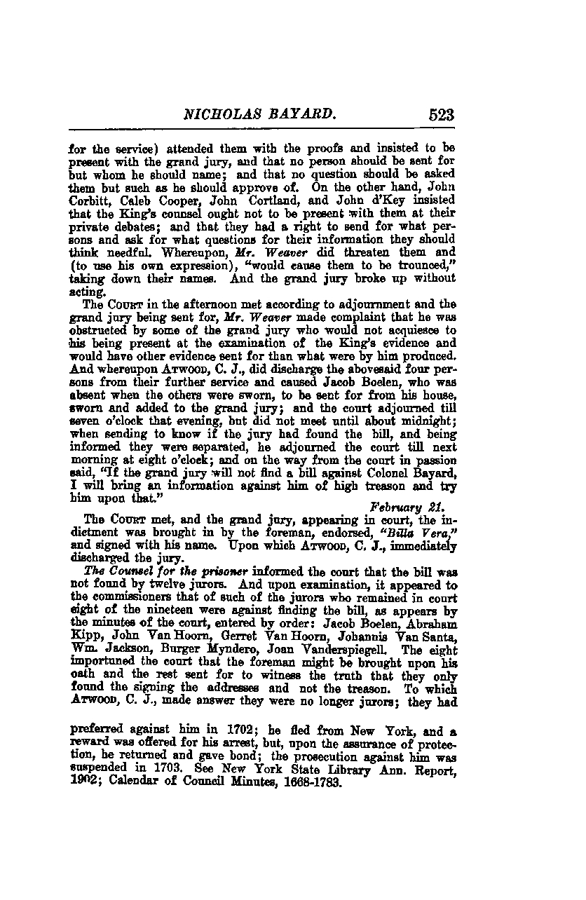 In 1702, charges were preferred against Bayard; he fled from New York, and a reward was offered for his arrest. However, upon the assurance of protection, he returned and gave bond. The prosecution against him was suspended in 1703. See New York State Library Annual Report, 1902; Calendar of Council Minutes, 1668-1783.