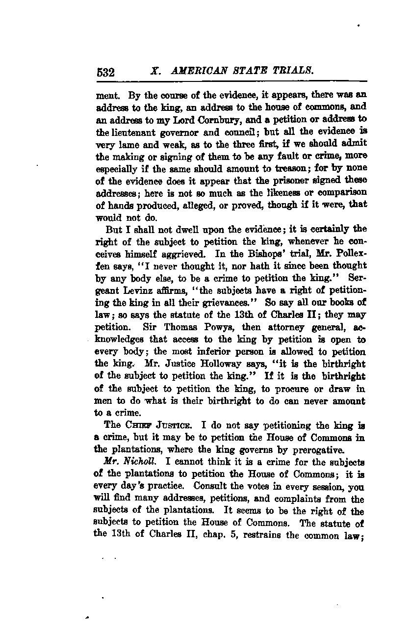 **The Chief Justice:** I do not say petitioning the king is a crime, but it may be a crime to petition the House of Commons in the plantations, where the king governs by prerogative.
