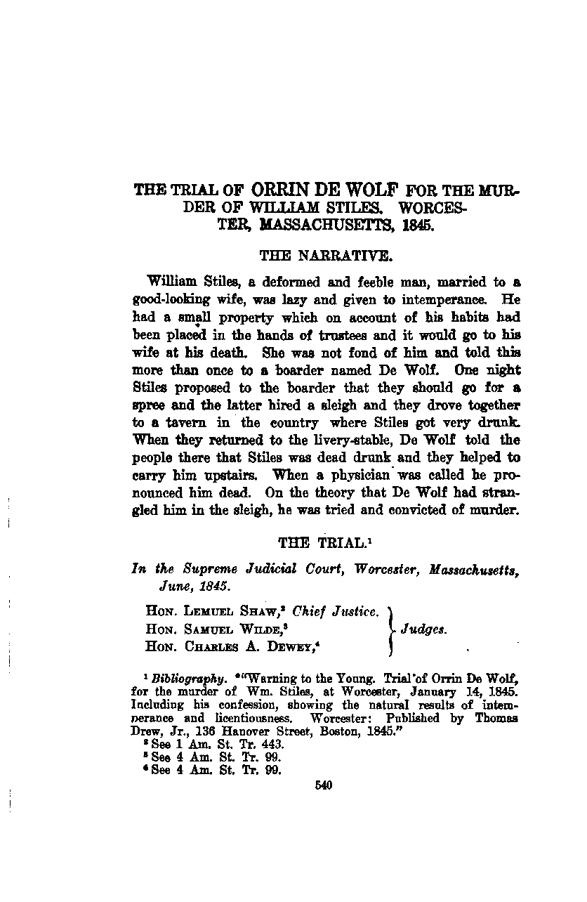 THE TRIAL OF ORRIN DE WOLF FOR THE MURDER OF WILLIAM STILES, WORCESTER, MASSACHUSETTS, 1845