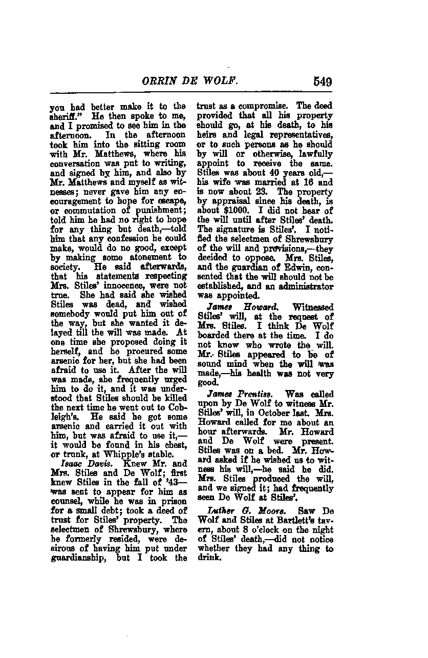 "You had better make it to the sheriff," he said to me. I promised to see him in the afternoon. In the afternoon, I took him into the sitting room with Mr. Matthews, where his conversation was put to writing and signed by him, as well as by Mr. Matthews and myself as witnesses. I never gave him any encouragement to hope for escape or commutation of punishment; I told him he had no right to hope for anything but death. I told him that any confession he could make would do no good, except by making some atonement to society. He said afterwards that his statements respecting Mrs. Stiles' innocence were not true. She had said she wished Stiles was dead and wished somebody would put him out of the way, but she wanted it delayed until the will was made. At one time, she proposed doing it herself, and he procured some arsenic for her, but she had been afraid to use it. After the will was made, she frequently urged him to do it, and it was understood that Stiles should be killed the next time he went out to Cobleigh's. He said he got some arsenic and carried it out with him, but was afraid to use it. It would be found in his chest or trunk at Whipple’s stable.