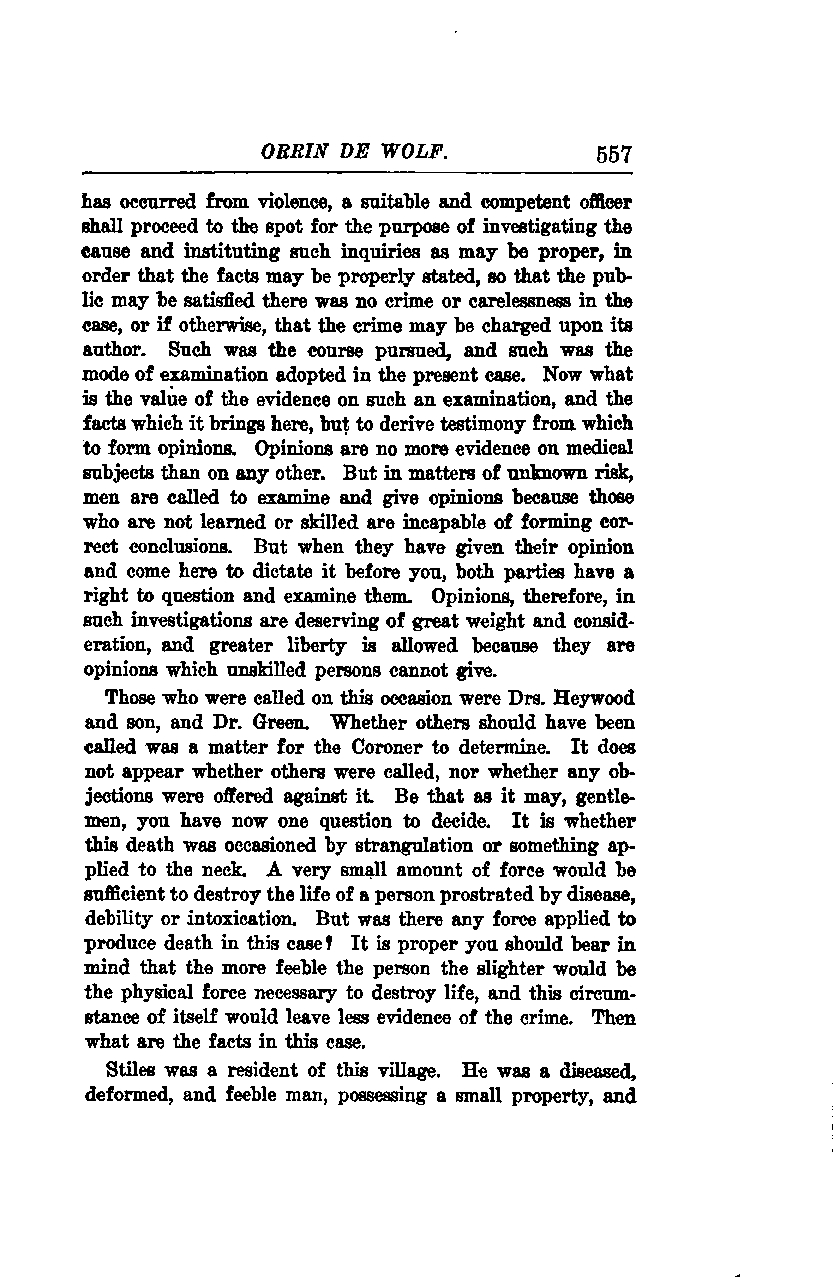 When a death has occurred from violence, a suitable and competent officer shall proceed to the spot for the purpose of investigating the cause and instituting such inquiries as may be proper. This is done in order that the facts may be properly stated, so that the public may be satisfied there was no crime or carelessness in the case, or if otherwise, that the crime may be charged upon its author. Such was the course pursued, and such was the mode of examination adopted in the present case. Now, what is the value of the evidence on such an examination, and the facts which it brings here, but to derive testimony from which to form opinions? Opinions are no more evidence on medical subjects than on any other. But in matters of unknown risk, men are called to examine and give opinions because those who are not learned or skilled are incapable of forming correct conclusions. But when they have given their opinion and come here to dictate it before you, both parties have a right to question and examine them. Opinions, therefore, in such investigations are deserving of great weight and consideration, and greater liberty is allowed because they are opinions which unskilled persons cannot give.
