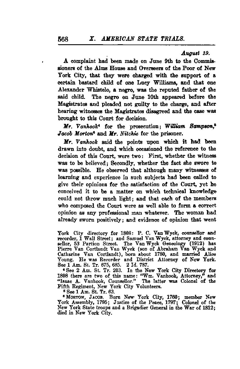 - **New York City directory for 1808:** P. C. Van Wyck, counsellor and recorder, 1 Wall Street; and Samuel Van Wyck, attorney and counsellor, 53 Partition Street. The Van Wyck Genealogy (1912) lists Pierre Van Cortlandt Van Wyck (son of Abraham Van Wyck and Catharine Van Cortlandt), born about 1780, and married to Alice Young. He served as Recorder and District Attorney of New York. See 1 Am. St. Tr. 675, 685. 2 Id. 787.