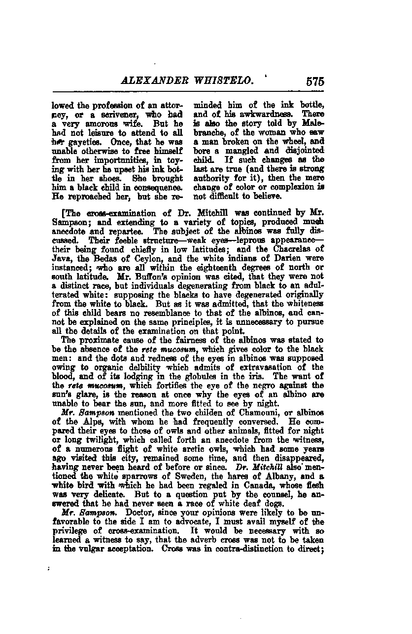 The cross-examination of Dr. Mitchill was continued by Mr. Sampson and extended to a variety of topics, producing much anecdote and repartee. The subject of albinos was fully discussed, including their feeble structure, weak eyes, leprous appearance, and their being found chiefly in low latitudes. The Chacrelas of Java, the Bedas of Ceylon, and the white Indians of Darien were instanced; all are within the eighteenth degrees of north or south latitude. Mr. Buffon’s opinion was cited, that they were not a distinct race, but individuals degenerating from black to an adulterated white, supposing the blacks to have degenerated originally from white to black. However, as it was admitted that the whiteness of this child bears no resemblance to that of the albinos and cannot be explained on the same principles, it is unnecessary to pursue all the details of the examination on that point.