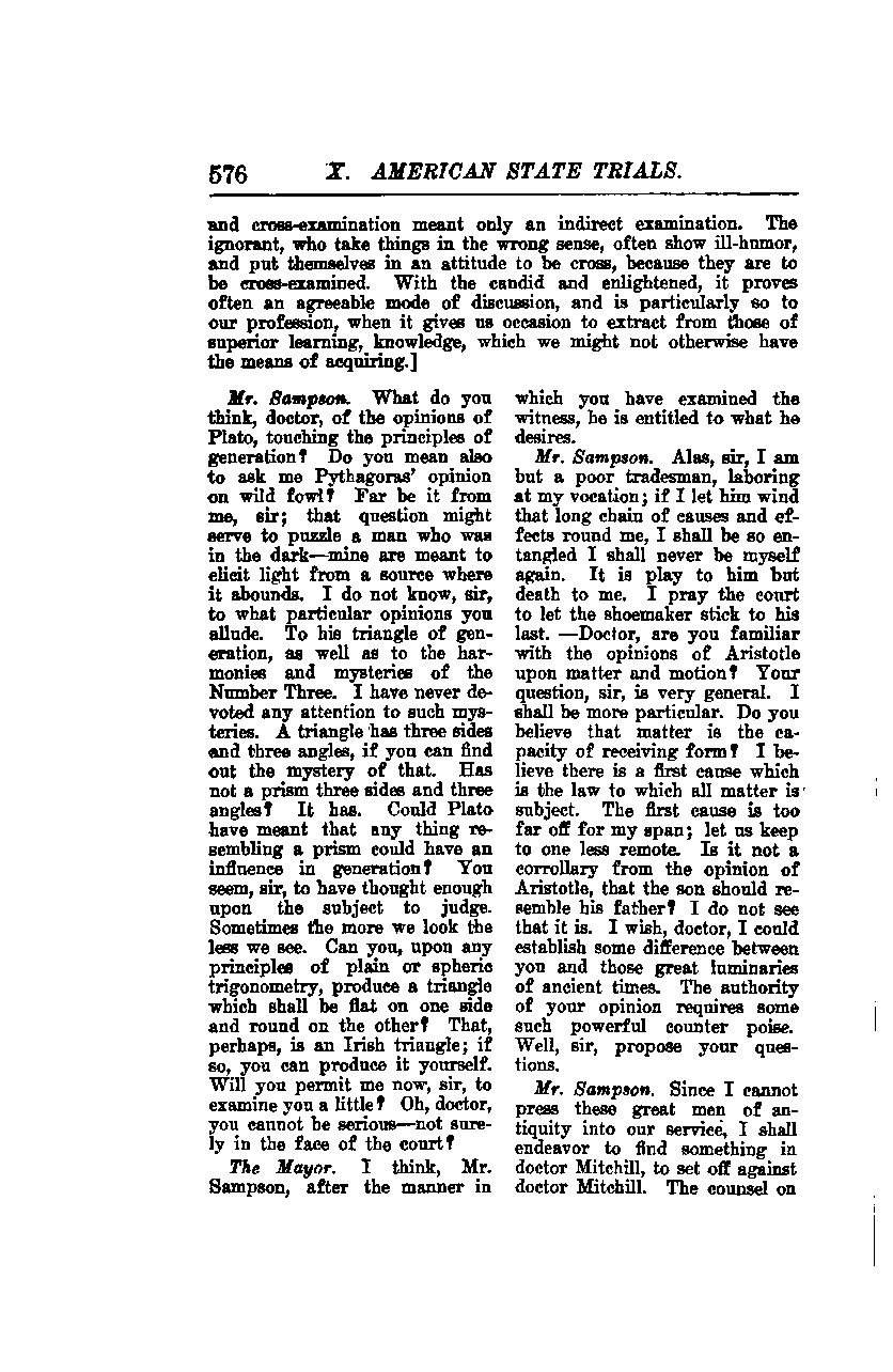 Mr. Sampson: I wish, doctor, I could establish some difference between you and those great luminaries of ancient times. The authority of your opinion requires some such powerful counterpoise. Well, sir, propose your questions.