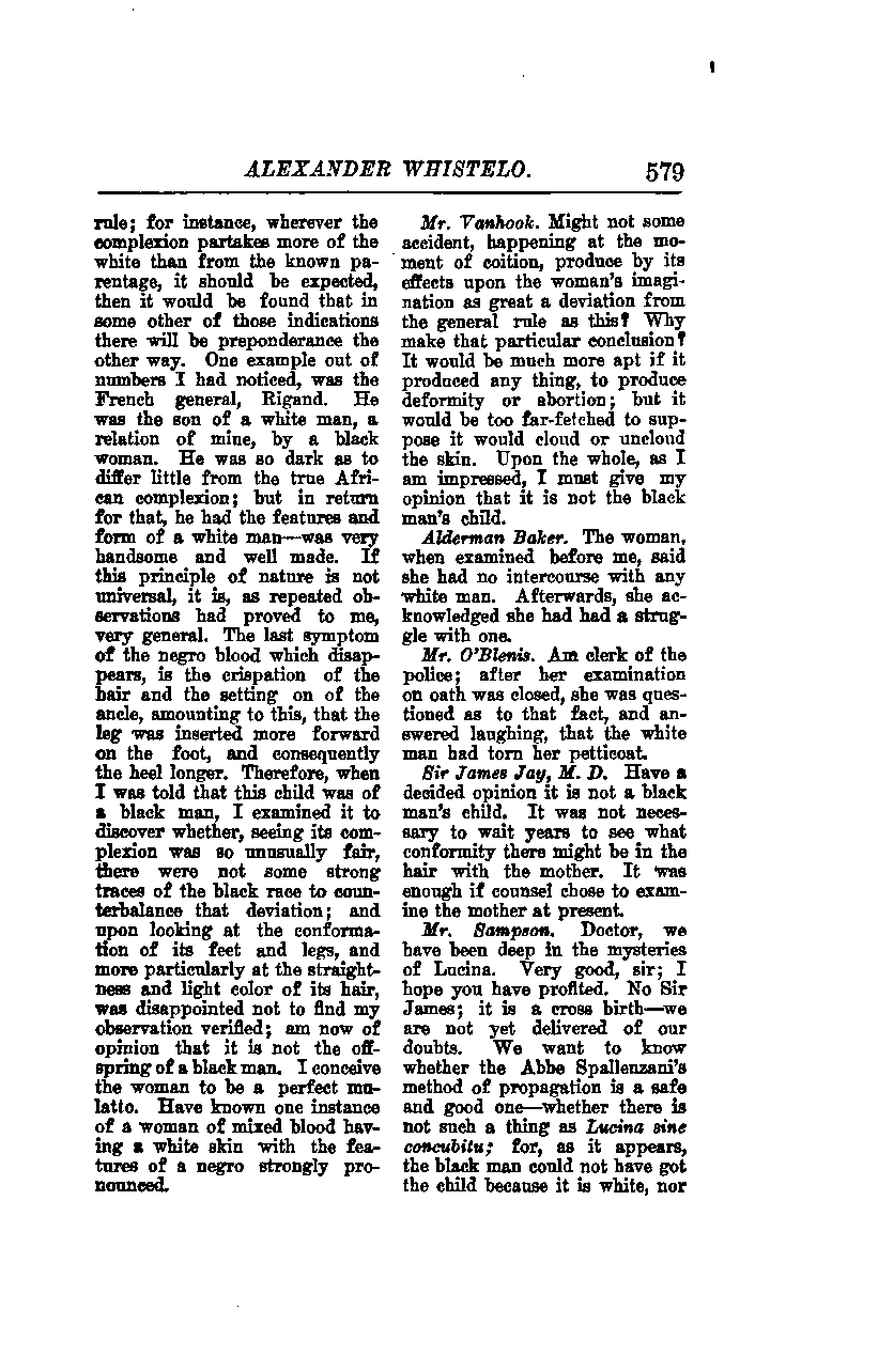 **Mr. Sampson:** No, Sir James; it is a cross birth—we are not yet delivered of our doubts. We want to know whether the Abbe Spallanzani’s method of propagation is a safe and good one—whether there is not such a thing as Lucina sine concubitu; for, as it appears, the black man could not have got the child because it is white, nor...
