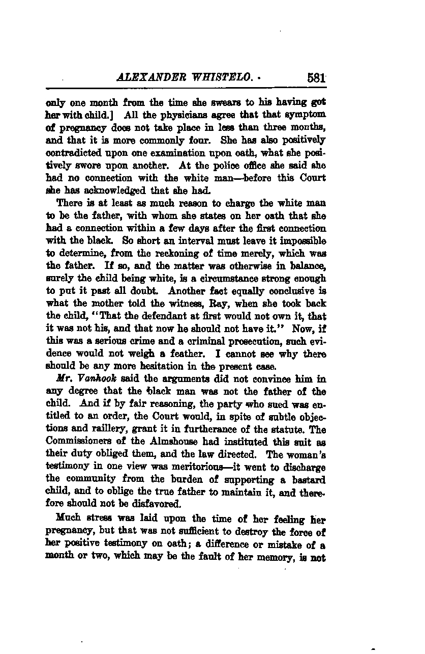 There is at least as much reason to charge the white man as the father, with whom she states on her oath that she had a connection within a few days after the first connection with the black. So short an interval must leave it impossible to determine, from the reckoning of time merely, which was the father. If so, and the matter was otherwise in balance, surely the child being white is a circumstance strong enough to put it past all doubt. Another fact equally conclusive is what the mother told the witness, Ray, when she took back the child: "That the defendant at first would not own it, that it was not his, and that now he should not have it." Now, if this were a serious crime and a criminal prosecution, such evidence would not weigh a feather. I cannot see why there should be any more hesitation in the present case.