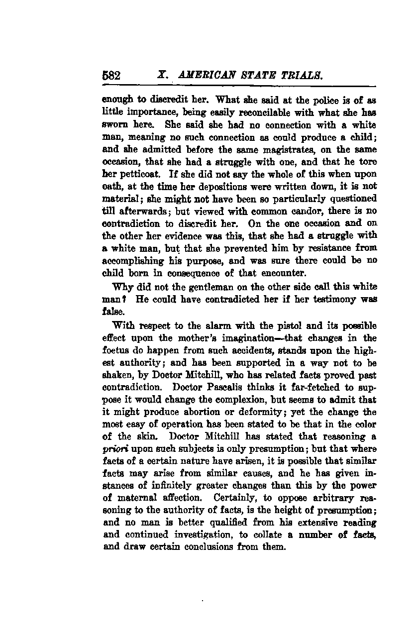 With respect to the alarm with the pistol and its possible effect upon the mother’s imagination—that changes in the fetus do happen from such accidents—stands upon the highest authority; and has been supported in a way not to be shaken, by Doctor Mitchill, who has related facts proved beyond contradiction. Doctor Pasealis thinks it far-fetched to suppose it would change the complexion, but seems to admit that it might produce abortion or deformity; yet the change most easily produced has been stated to be that in the color of the skin. Doctor Mitchill has stated that reasoning a priori upon such subjects is only presumption; but that where facts of a certain nature have arisen, it is possible that similar facts may arise from similar causes, and he has given instances of infinitely greater changes than this by the power of maternal affection. Certainly, to oppose arbitrary reasoning to the authority of facts is the height of presumption; and no man is better qualified from his extensive reading and continued investigation, to collate a number of facts, and draw certain conclusions from them.