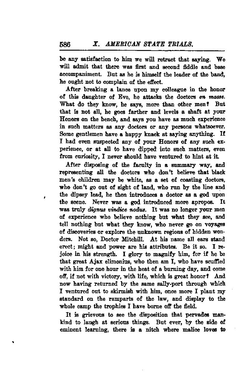 After disposing of the faculty in a summary way, and representing all the doctors who don't believe that black men's children may be white as a set of coasting doctors, who don't go out of sight of land, who run by the line and the dipsy lead, he then introduces a doctor as a god upon the scene. Never was a god introduced more apropos. It was truly dignus vindice nodus. It was no longer your men of experience who believe nothing but what they see, and tell nothing but what they know, who never go on voyages of discoveries or explore the unknown regions of hidden wonders. Not so, Doctor Mitchill. At his name, all ears stand erect; might and power are his attributes. Be it so. I rejoice in his strength. I glory to magnify him, for if he be that great Ajax elimonins, who then am I, who have scuffled with him for one hour in the heat of a burning day, and come off, if not with victory, with life, which is great honor? And now, having returned by the same sally-port through which I ventured out to skirmish with him, once more I plant my standard on the ramparts of the law, and display to the whole camp the trophies I have borne off the field.