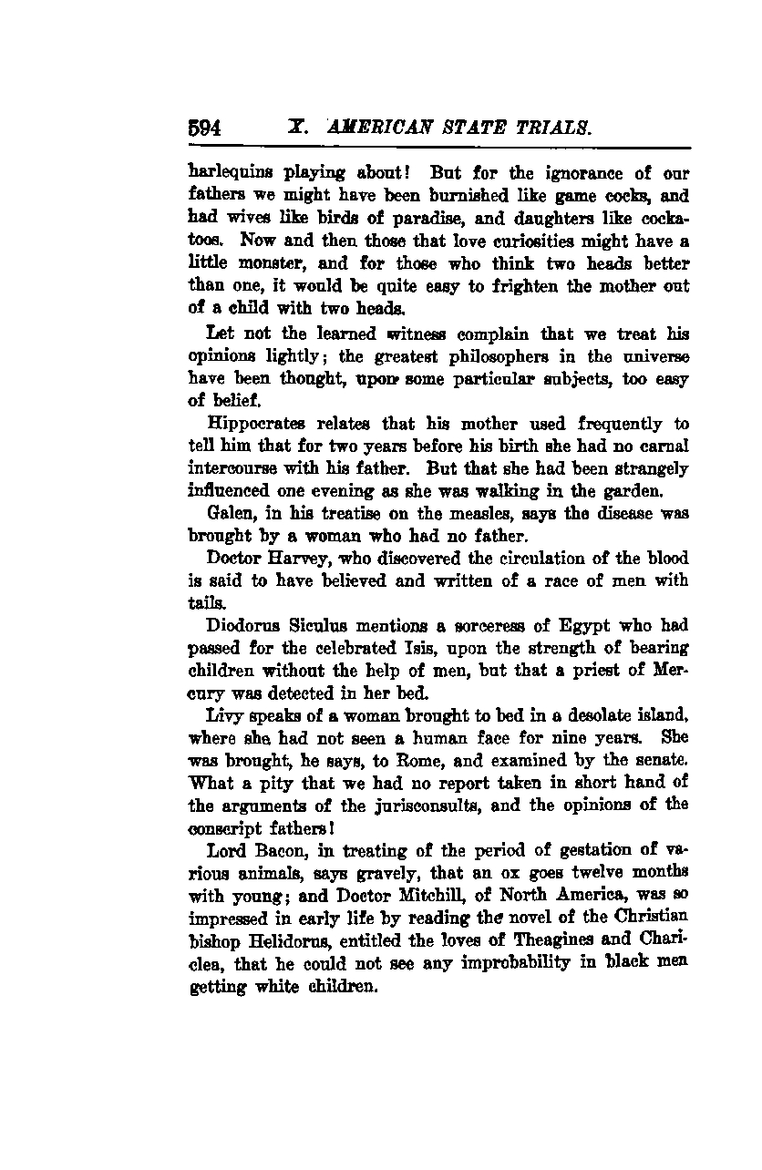 Lord Bacon, in treating of the period of gestation of various animals, says gravely that an ox goes twelve months with young; and Doctor Mitchill, of North America, was so impressed in early life by reading the novel of the Christian bishop Heliodorus, entitled "The Loves of Theagines and Chariclea," that he could not see any improbability in black men getting white children.