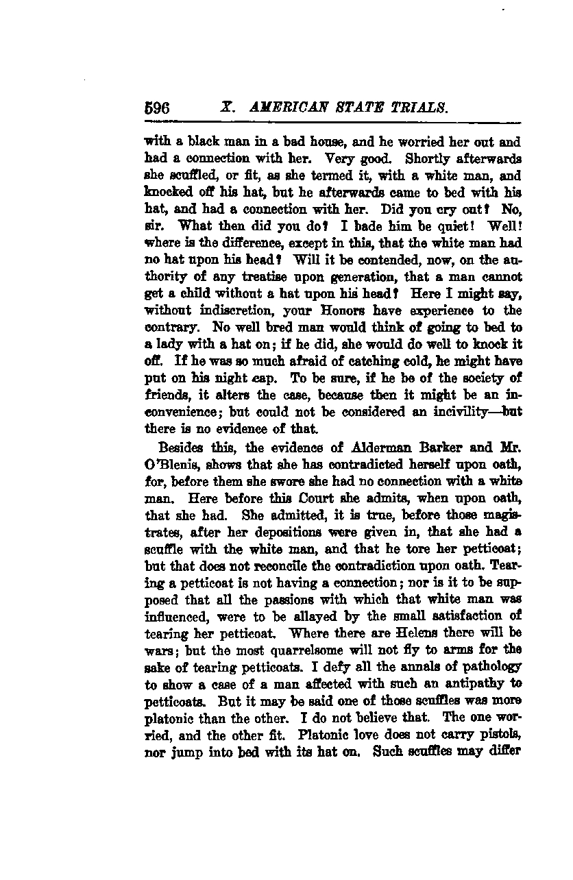 She was with a black man in a bad house, and he worried her out and had a connection with her. Very good. Shortly afterwards, she scuffled, or fought, as she termed it, with a white man, and knocked off his hat, but he afterwards came to bed with his hat, and had a connection with her. Did you cry out? No, sir. What then did you do? I bade him be quiet! Well! Where is the difference, except in this, that the white man had no hat upon his head? Will it be contended, now, on the authority of any treatise upon generation, that a man cannot get a child without a hat upon his head? Here I might say, without indiscretion, your Honors have experience to the contrary. No well-bred man would think of going to bed to a lady with a hat on; if he did, she would do well to knock it off. If he was so much afraid of catching cold, he might have put on his nightcap. To be sure, if he be of the Society of Friends, it alters the case, because then it might be an inconvenience; but could not be considered an incivility—but there is no evidence of that.