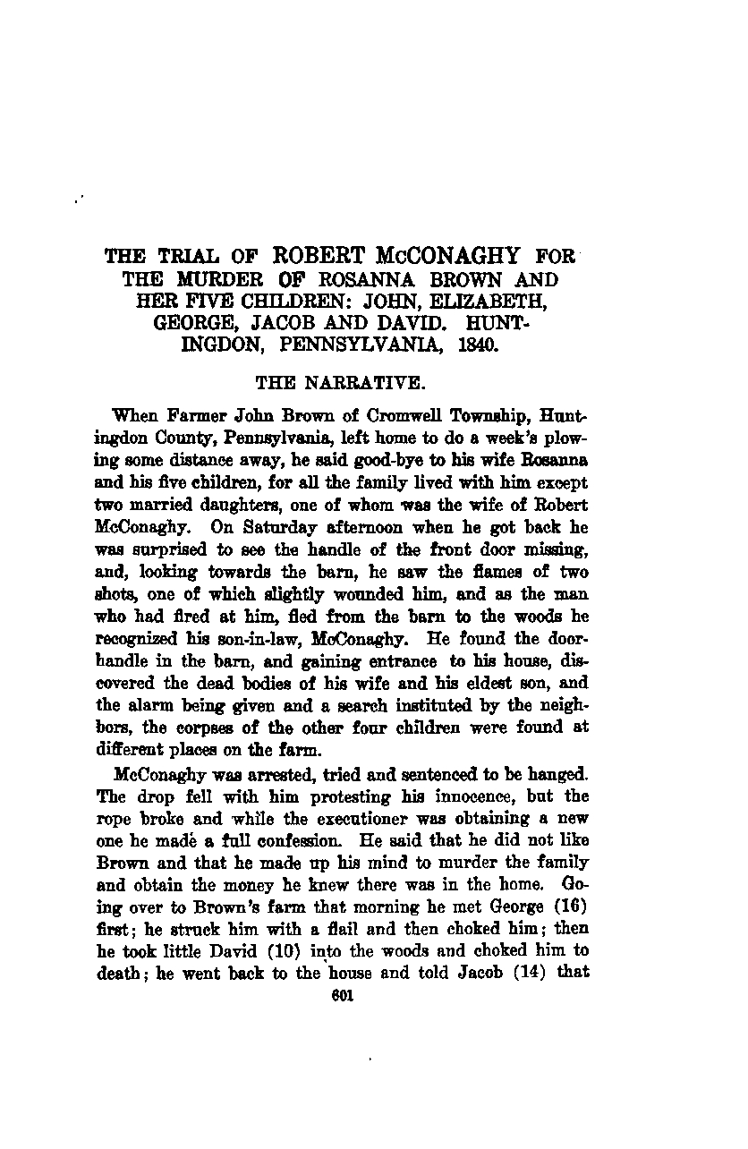 THE TRIAL OF ROBERT MCCONAGHY FOR THE MURDER OF ROSANNA BROWN AND HER FIVE CHILDREN: JOHN, ELIZABETH, GEORGE, JACOB, AND DAVID, HUNTINGDON, PENNSYLVANIA, 1840.