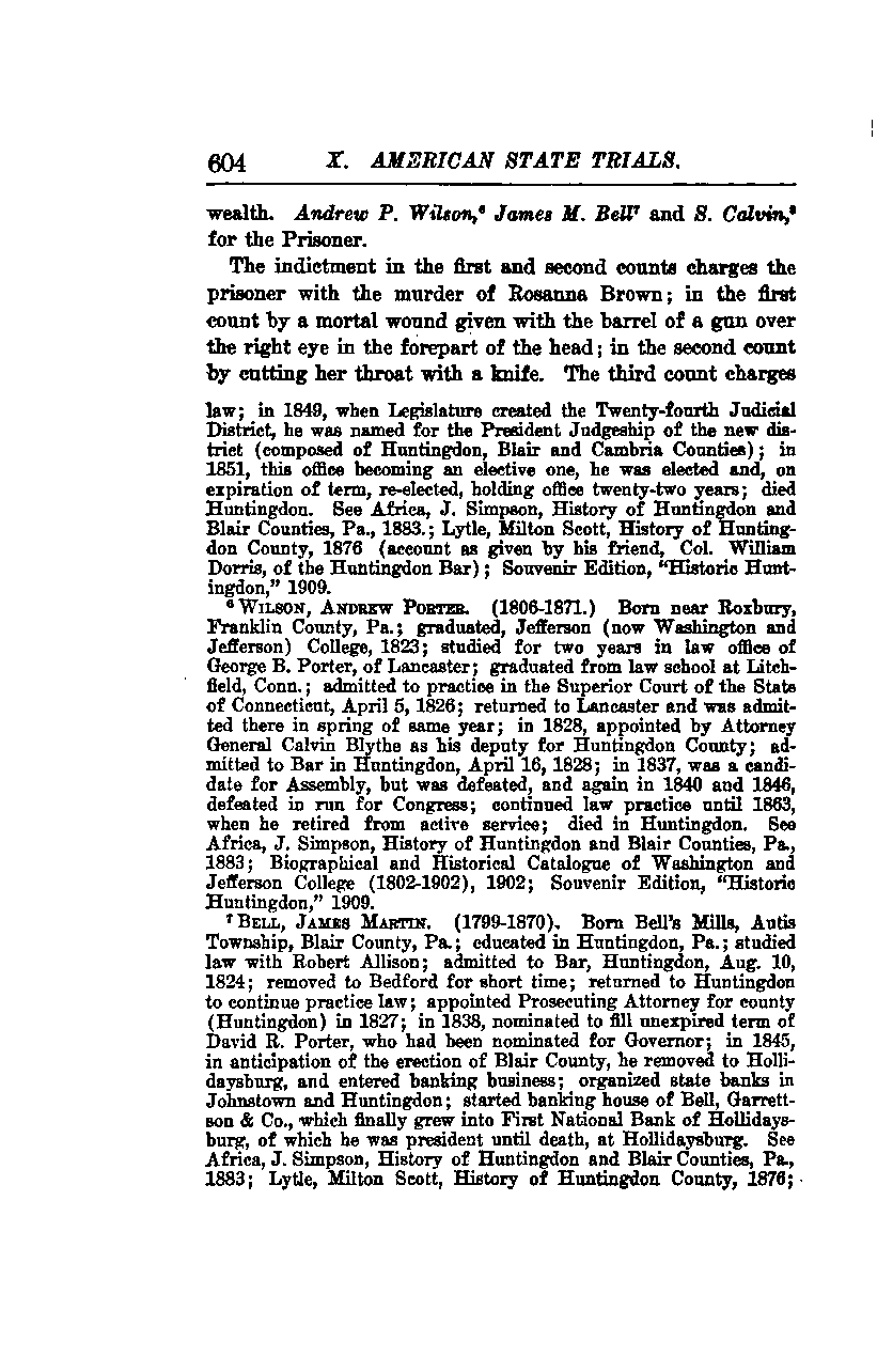 **Andrew Porter Wilson** (1806-1871): Born near Roxbury, Franklin County, Pa.; graduated from Jefferson (now Washington and Jefferson) College in 1823; studied for two years in the law office of George B. Porter of Lancaster; graduated from law school at Litchfield, Conn.; admitted to practice in the Superior Court of the State of Connecticut on April 5, 1826; returned to Lancaster and was admitted there in the spring of the same year. In 1828, he was appointed by Attorney General Calvin Blythe as his deputy for Huntingdon County; admitted to the Bar in Huntingdon on April 16, 1828. In 1837, he was a candidate for the Assembly but was defeated, and again in 1840 and 1846, he was defeated in his run for Congress. He continued his law practice until 1863, when he retired from active service; died in Huntingdon. See Africa, J. Simpson, *History of Huntingdon and Blair Counties, Pa.*, 1883; *Biographical and Historical Catalogue of Washington and Jefferson College (1802-1902)*, 1902; Souvenir Edition, "Historic Huntingdon," 1909.