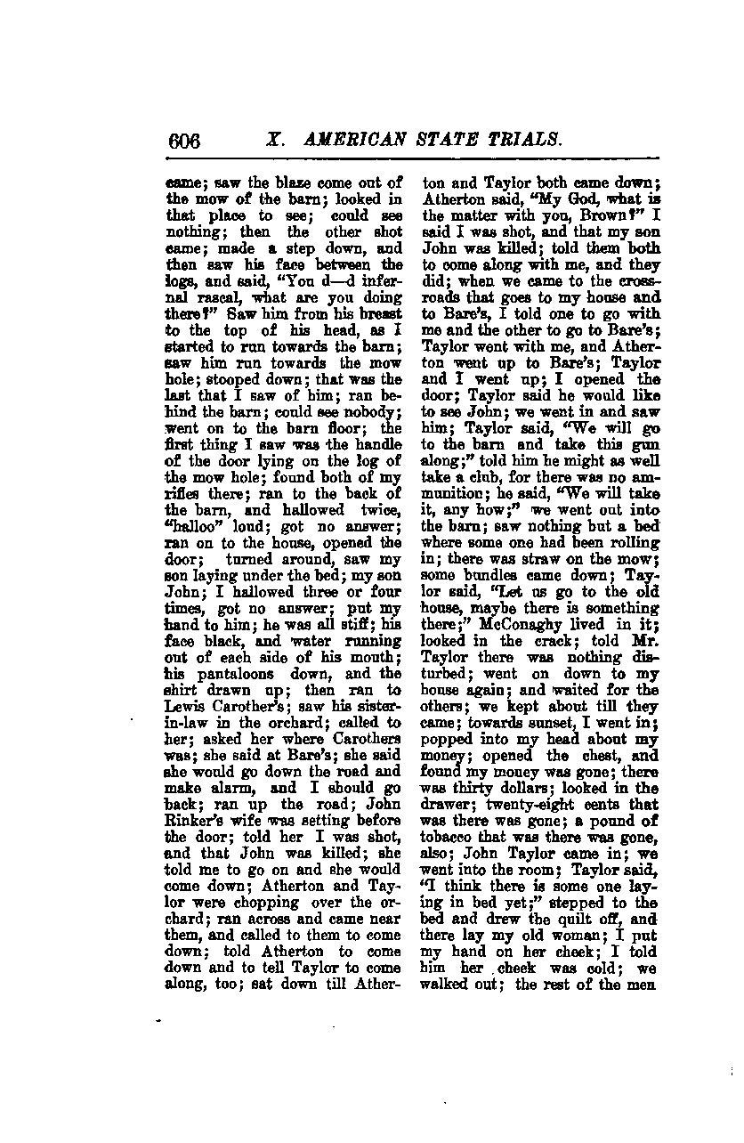 I came and saw the blaze coming out of the mow of the barn. I looked in that place to see but could see nothing. Then the other shot came. I made a step down and then saw his face between the logs. I said, "You damned infernal rascal, what are you doing there?" I saw him from his breast to the top of his head as I started to run towards the barn. I saw him run towards the mow hole and stoop down. That was the last that I saw of him. I ran behind the barn but could see nobody. I went on to the barn floor, and the first thing I saw was the handle of the door lying on the log of the mow hole. I found both of my rifles there. I ran to the back of the barn and hollered twice, "Hallo" loud, but got no answer. I ran on to the house, opened the door, turned around, and saw my gun lying under the bed. My son John was there; I hollered three or four times but got no answer. I put my hand to him; he was all stiff, his face black, and water running out of each side of his mouth. His pantaloons were down, and his shirt drawn up. Then I ran to Lewis Carother's and saw his sister-in-law in the orchard. I called to her and asked her where Carothers was. She said he was at Bare's. She said she would go down the road and make an alarm, and I should go back. I ran up the road; John Rinker's wife was sitting before the door. I told her I was shot and that John was killed. She told me to go on and she would come down. Atherton and Taylor were chopping over the orchard. I ran across and came near them, and called to them to come down. I told Atherton to come down and to tell Taylor to come along, too. I sat down until Atherton and Taylor both came down. Atherton said, "My God, what is the matter with you, Brown?" I said I was shot and that my son John was killed. I told them both to come along with me, and they did.