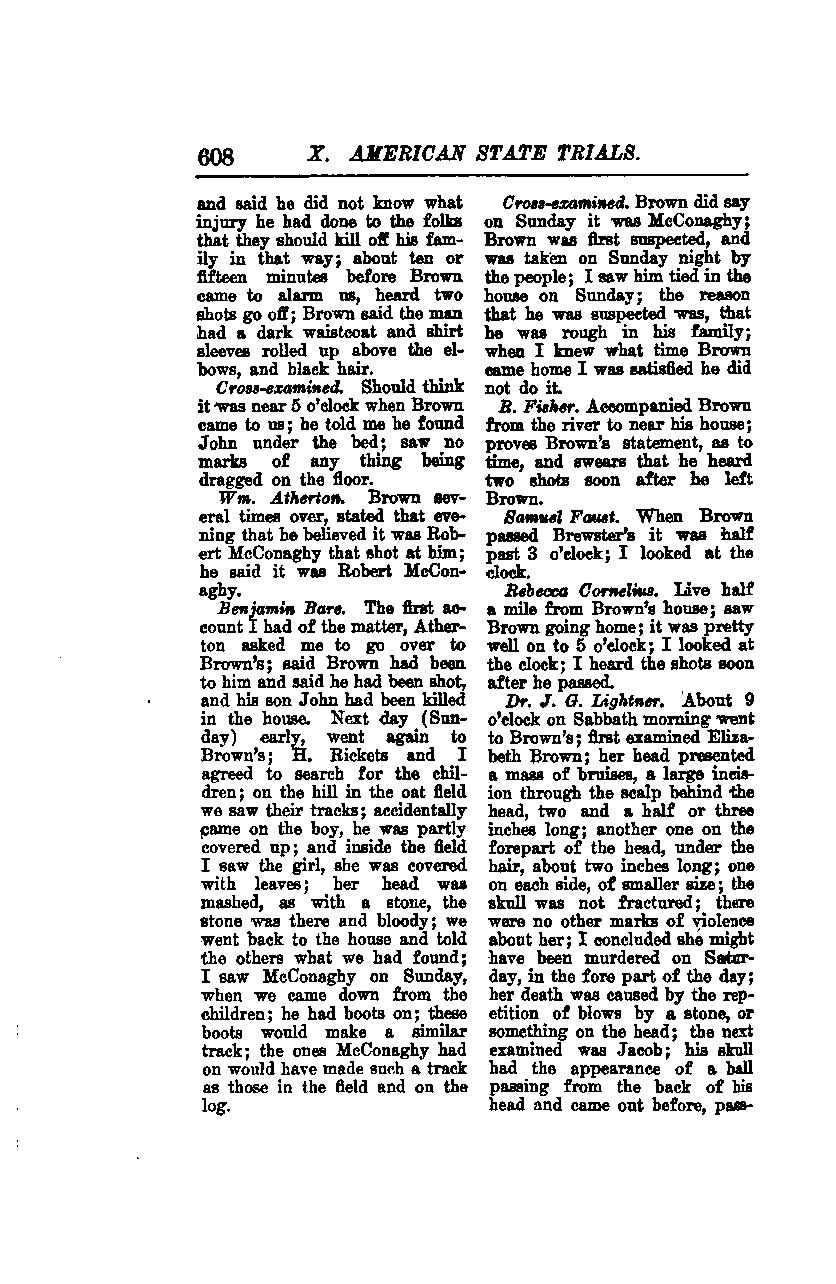 **Dr. J. G. Lightner:** About 9 o'clock on Sabbath morning, I went to Brown’s. I first examined Elizabeth Brown. Her head presented a mass of bruises, a large incision through the scalp behind the head, two and a half or three inches long; another one on the forepart of the head, under the hair, about two inches long; one on each side, of smaller size. The skull was not fractured. There were no other marks of violence about her. I concluded she might have been murdered on Saturday, in the fore part of the day. Her death was caused by the repetition of blows by a stone, or something on the head. The next examined was Jacob; his skull had the appearance of a ball passing from the back of his head and coming out before, passing...