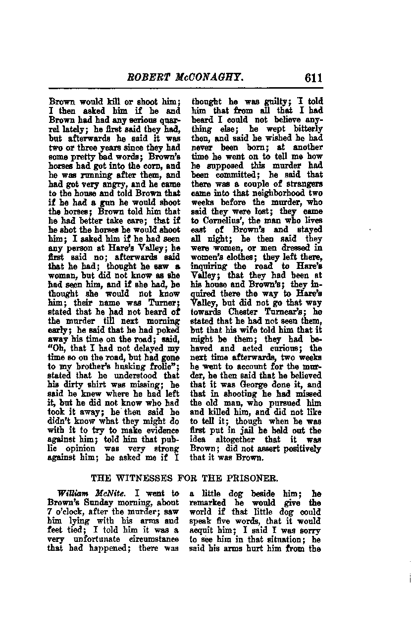 **William McNite:** I went to Brown's Sunday morning, about 7 o'clock, after the murder. I saw him lying with his arms and feet tied. I told him it was a very unfortunate circumstance that had happened. There was a little dog beside him. He remarked he would give the world if that little dog could speak five words, that it would acquit him. I said I was sorry to see him in that situation. He said his arms hurt him from the tight binding.