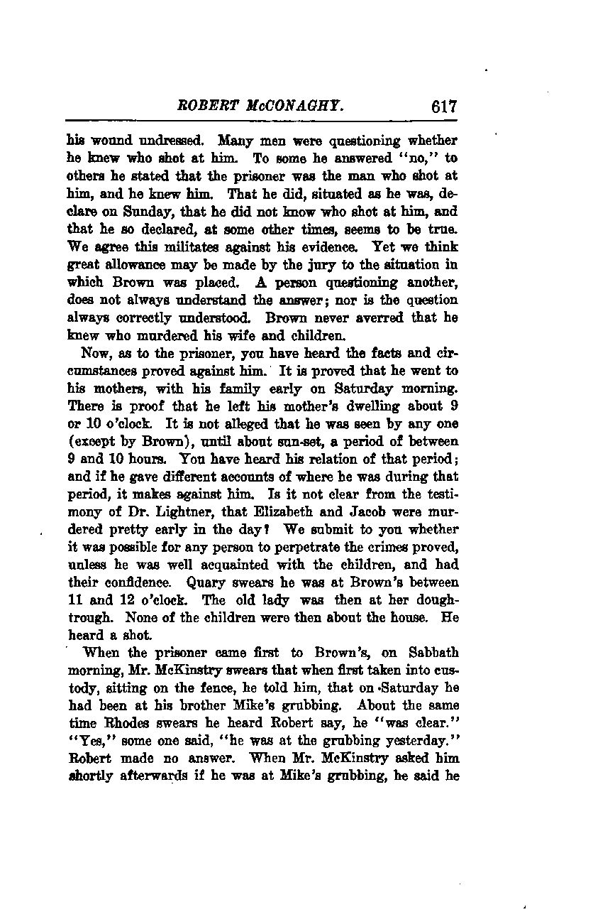 When the prisoner came first to Brown's on Sabbath morning, Mr. McKinstry swears that when first taken into custody, sitting on the fence, he told him that on Saturday, he had been at his brother Mike's grubbing. About the same time, Rhodes swears he heard Robert say, "I was clear." "Yes," some one said, "he was at the grubbing yesterday." Robert made no answer. When Mr. McKinstry asked him shortly afterwards if he was at Mike's grubbing, he said he was.