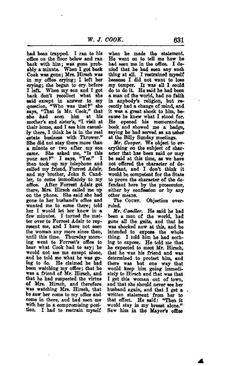 Mr. Candler: He said he had been a man of the world, had gone all the gaits, and that he was shocked now at this, and he intended to expose the whole thing. I told him he had nothing to expose. He told me that he expected to meet Mr. Hirsch, that he was his friend and was determined to protect him, and there was but one way that would keep him from going immediately to Hirsch, and that was that I get this woman out of town, and that she should never see her husband again, and that I get a written statement from her to that effect. He said, "Then it would stay in my breast alone." I saw him in the Mayor's office.