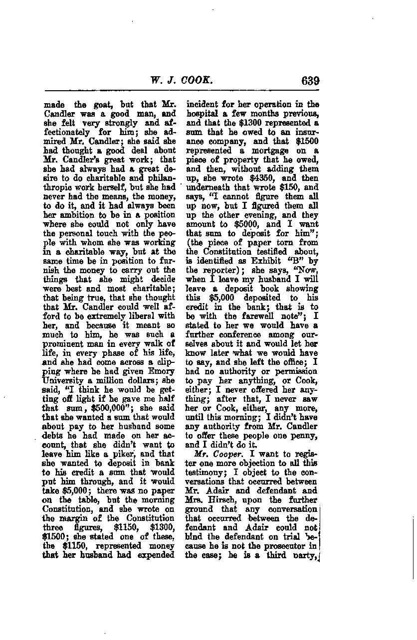 W. J. Cook, 639, made the claim, but that Mr. Candler was a good man, and she felt very strongly and affectionately for him. She admired Mr. Candler and said she had thought a good deal about Mr. Candler's great work. She had always had a great desire to do charitable and philanthropic work herself, but she had never had the means or the money to do it. It had always been her ambition to be in a position where she could not only have the personal touch with the people with whom she was working in a charitable way, but at the same time be in a position to furnish the money to carry out the things that she might decide were best and most charitable.
