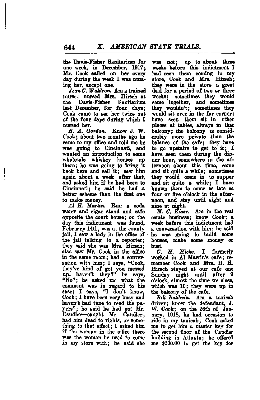 Al H. Martin runs a soda water and cigar stand and café opposite the courthouse. On the day the indictment was found, February 14th, he was at the county jail. He saw a lady in the jail office talking to a reporter; they said she was Mrs. Hirsch. He also saw Mr. Cook in the office in the game room and had a conversation with him. Martin said, "Cook, they've kind of got you messed up, haven't they?" Cook replied, "No." He asked Martin what the comment was in regard to his case. Martin said, "I don't know, Cook; I have been very busy and haven't had time to read the papers." Cook said he had got Mr. Candler—caught Mr. Candler; had him dead to rights, or something to that effect. Martin asked if the woman in the office was the woman he used to come into his store with. Cook said she was not. Up to about three weeks before this indictment, Martin had seen Cook and Mrs. Hirsch coming into his store. They were in the store a great deal for a period of two or three weeks. Sometimes they would come together, and sometimes they wouldn't. Sometimes they would sit over in the far corner; Martin had seen them sit in other places at tables, always in that balcony. The balcony is considerably more private than the rest of the café; they have to go upstairs to get to it. Martin had seen them during the dinner hour, somewhere in the afternoon around this time, come and sit quite a while. Sometimes they would come in for supper and sit quite a while. He had known them to come as late as four or five o'clock in the afternoon and stay until eight and nine at night.