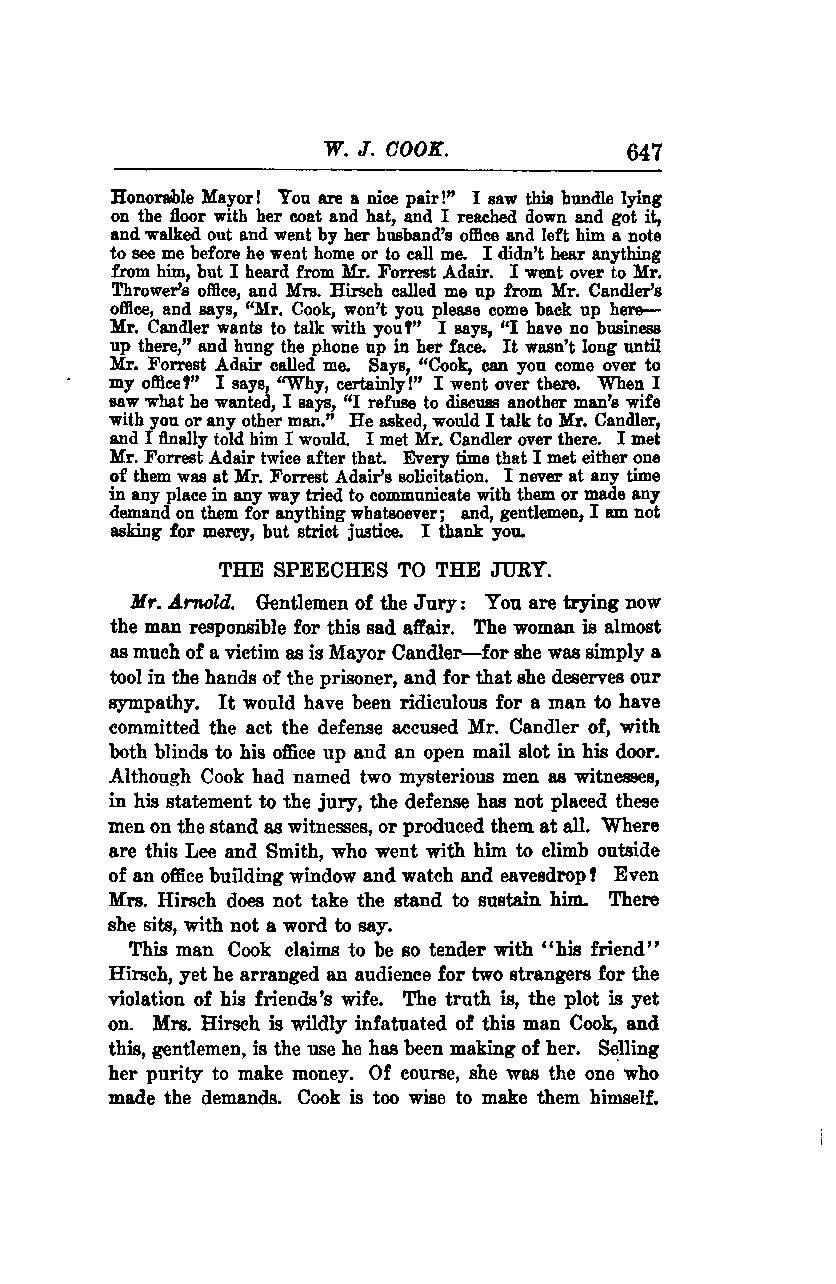 Mr. Arnold: Gentlemen of the Jury, you are trying now the man responsible for this sad affair. The woman is almost as much of a victim as is Mayor Candler—for she was simply a tool in the hands of the prisoner, and for that she deserves our sympathy. It would have been ridiculous for a man to have committed the act the defense accused Mr. Candler of, with both blinds to his office up and an open mail slot in his door. Although Cook had named two mysterious men as witnesses in his statement to the jury, the defense has not placed these men on the stand as witnesses, or produced them at all. Where are this Lee and Smith, who went with him to climb outside of an office building window and watch and eavesdrop? Even Mrs. Hirsch does not take the stand to sustain him. There she sits, with not a word to say.