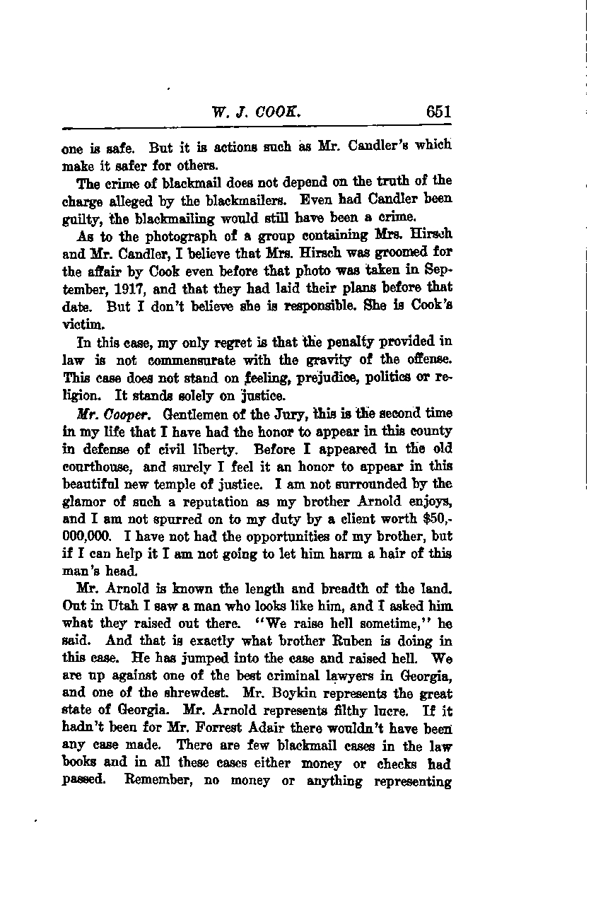 Mr. Arnold is known the length and breadth of the land. Out in Utah, I saw a man who looks like him, and I asked him what they raised out there. "We raise hell sometimes," he said. And that is exactly what brother Ruben is doing in this case. He has jumped into the case and raised hell. We are up against one of the best criminal lawyers in Georgia, and one of the shrewdest. Mr. Boykin represents the great state of Georgia. Mr. Arnold represents filthy lucre. If it hadn't been for Mr. Forrest Adair, there wouldn't have been any case made. There are few blackmail cases in the law books, and in all these cases, either money or checks had passed. Remember, no money or anything representing money passed in this case.