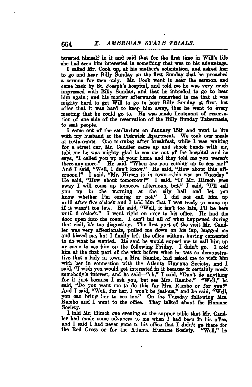 He came out of the sanitarium on January 15th and went to live with my husband at the Pickwick Apartment. We took our meals at restaurants. One morning after breakfast, while I was waiting for a streetcar, Mr. Candler came up and shook hands with me. He told me he was mighty glad to see me out of the hospital and said, "I called you up at your home and they told me you weren't there anymore." He asked, "When are you coming up to see me?" And I said, "Well, I don't know." He suggested, "How about this afternoon?" I replied, "Mr. Hirsch is in town—this was on Tuesday." He then asked, "How about tomorrow?" I said, "If Mr. Hirsch goes away, I will come up tomorrow afternoon, but," I said, "I'll call you up in the morning at the city hall and let you know whether I'm coming or not." I did not call him up until after five o'clock and told him that I was ready to come up if it wasn't too late. He said, "Well, it isn't too late, I'll be here until 6 o'clock." I went right on over to his office. He had the door open into the room. I can't tell all of what happened during that visit; it's too disgusting. The first part of the visit, Mr. Candler was very affectionate, pulled me down on his lap, hugged me, and kissed me, but I finally left the office without having consented to do what he wanted. He said he would expect me to call him up or come to see him on the following Friday. I didn't go. I told him at the first part of the visit, before when he was so demonstrative, that a lady in town, a Mrs. Rambo, had asked me to visit him with her in connection with the Atlanta Humane Society, and I said, "I wish you would get interested in it because it certainly needs somebody's interest." He said, "Oh," and I continued, "Don't do anything for it just because I ask you, but see Mrs. Rambo." "Well," he said, "Do you want me to do this for Mrs. Rambo or for you?" And I said, "Well, for her, I won't be jealous," and he said, "Well, you can bring her to see me." On the Tuesday following, Mrs. Rambo and I went to the office. They talked about the Humane Society.